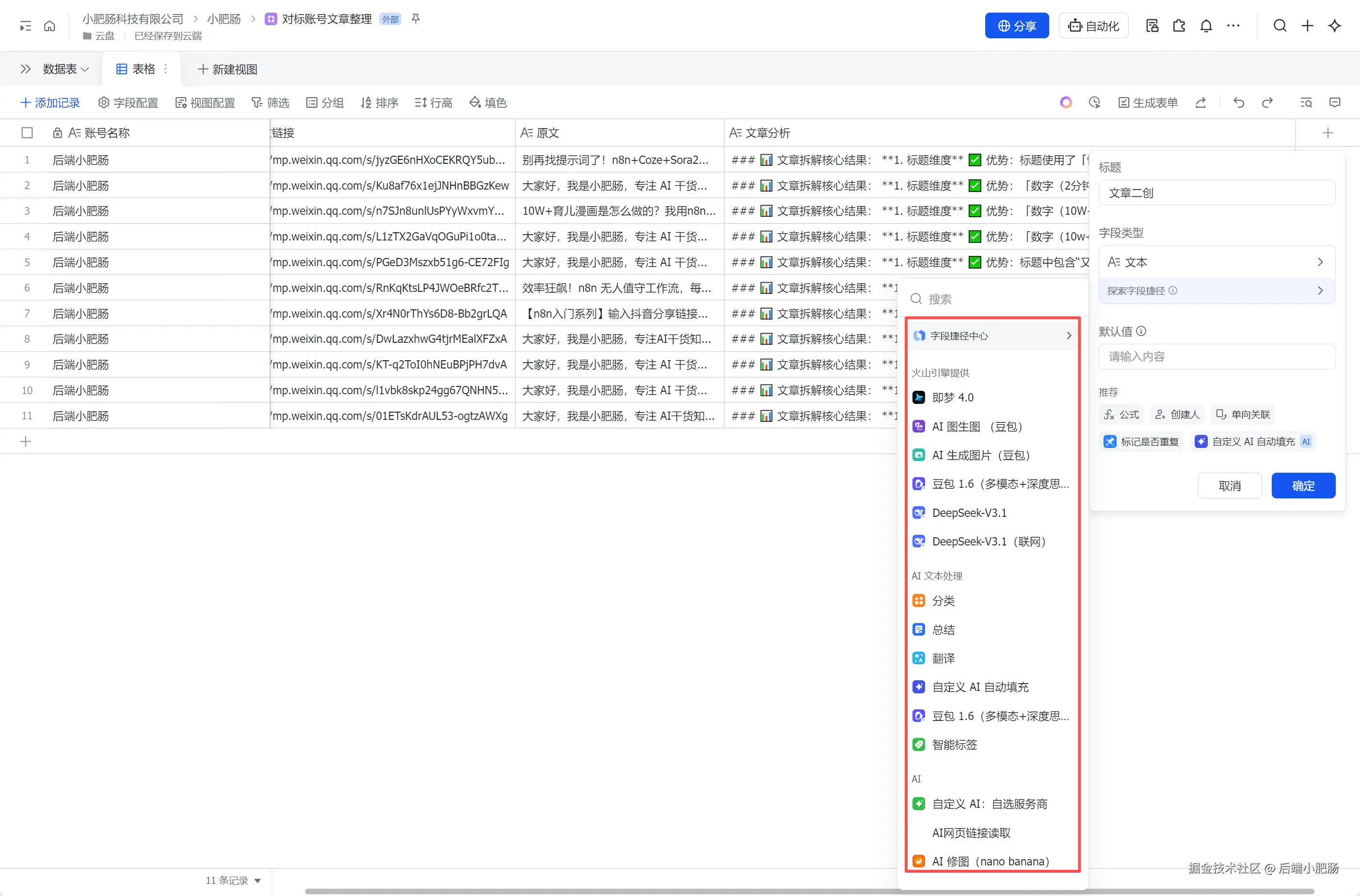 在 飞书 中可以利用字段捷径进行文章的二创改写,或者基于图表功能直观分析对标账号的文章内容。这块我之后会单开一个飞书专题讲。