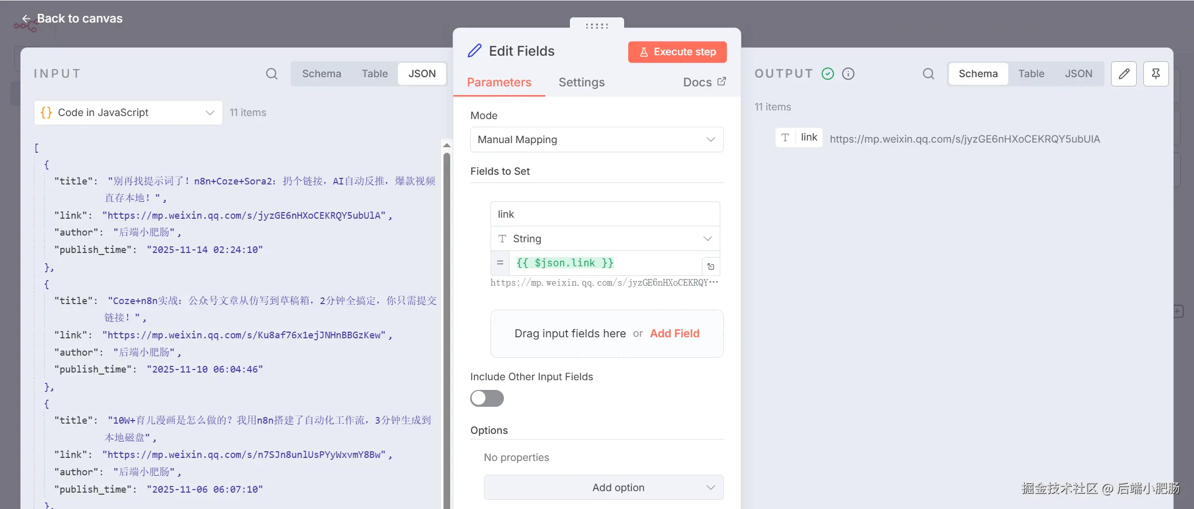 Edit Fields(取出文章链接):Code in JavaScript 节点出来后点击【+】新增Edit Fields节点,这个节点的作用是取出文章的链接给Coze工作流进行文章内容的提取和解析。