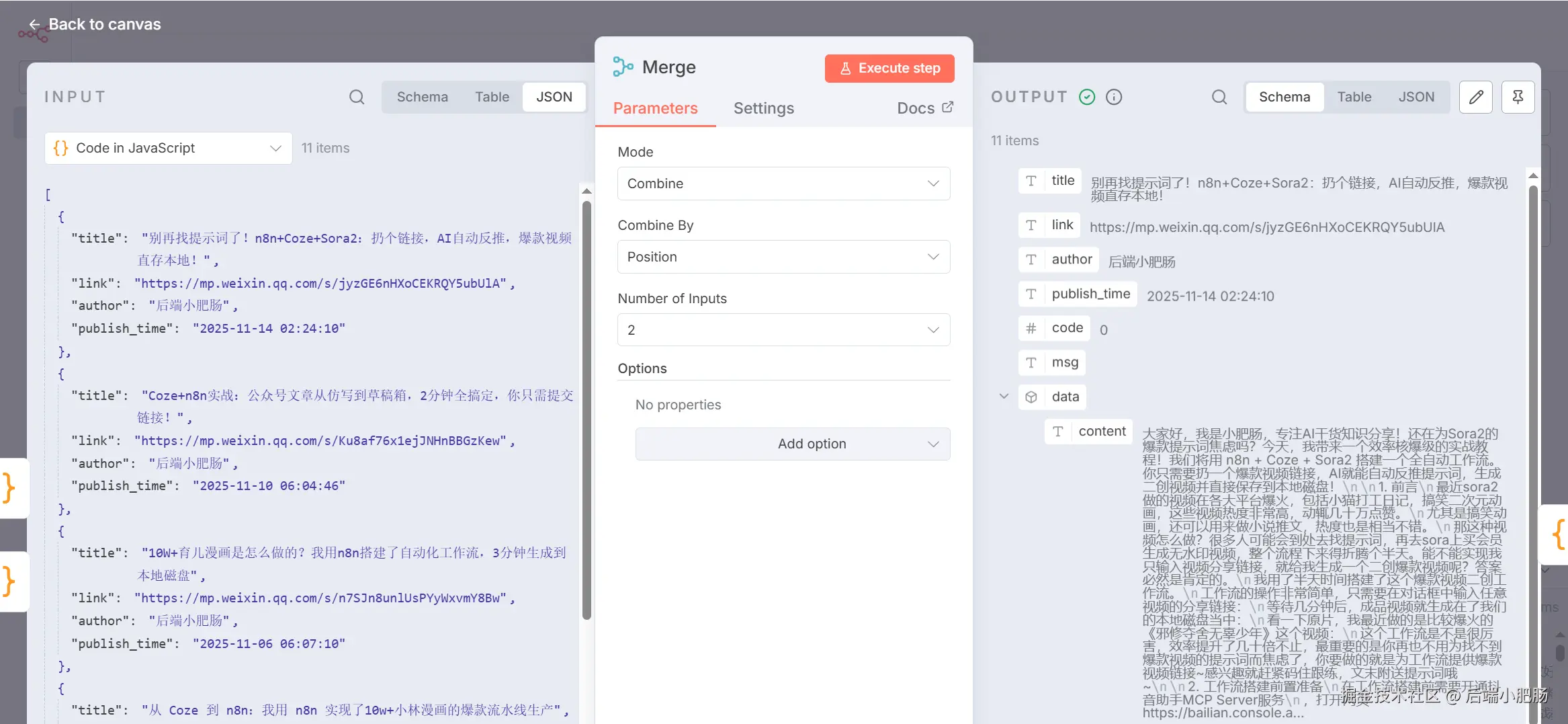Merge:HTTP Request(调用Coze 工作流 提取和解析文章) 和Code in JavaScript (封装对象) 节点后需要接Merge节点,承接两个节点的结果数据。