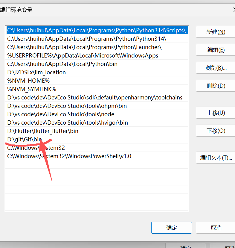 这个页面就突然闪退,消失不见了,当时我不知道怎么回事,于是把这个问题告诉给了豆包,来让它帮我解决,最后我找到了问题所在,是因为系统找不到git程序的路径,于是我找到git软件的位置,但是我之前就安装了git了,原来是Git 的环境变量没配置好于是我在path中配置了Git 的环境变量