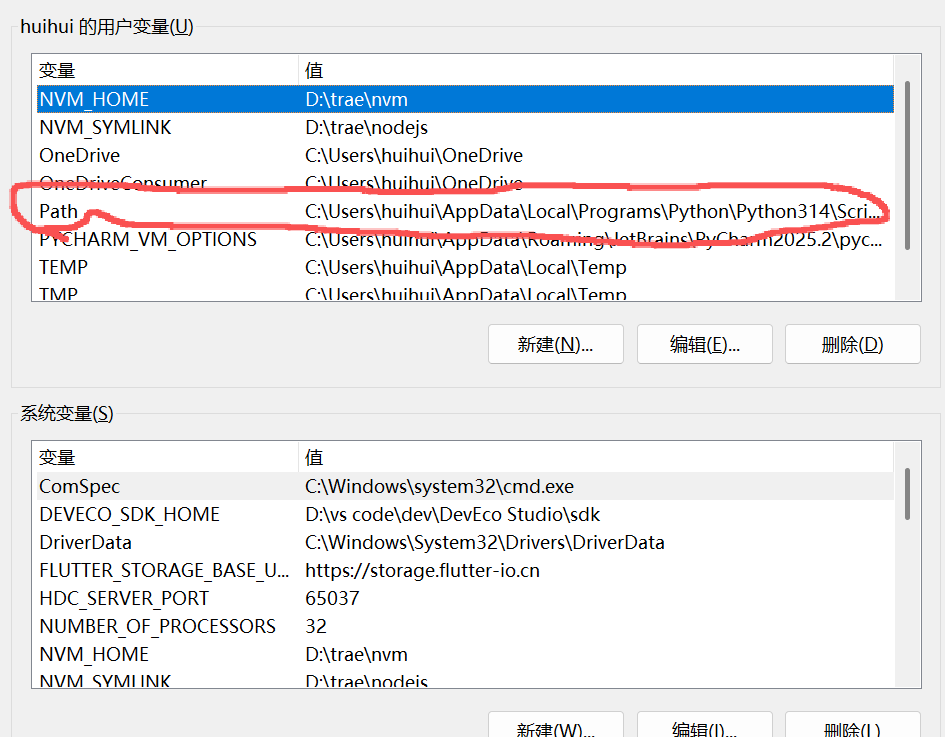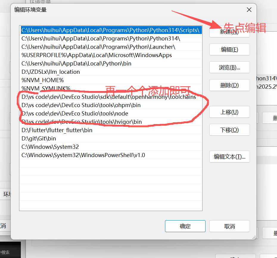 在该页面中,应该找到系统变量中变量名为path的变量,双击改变量进如编辑页面,然后找到自己电脑中下载DevEco Stduio的位置,复制如下几个文件位置,编辑添加到path变量里,这里不要看我写的位置找一样的,你是找不到的,因为我们电脑中下载的位置不一样,你只找到自己下载DevEco Stduio的位置,找到后面的就行了: