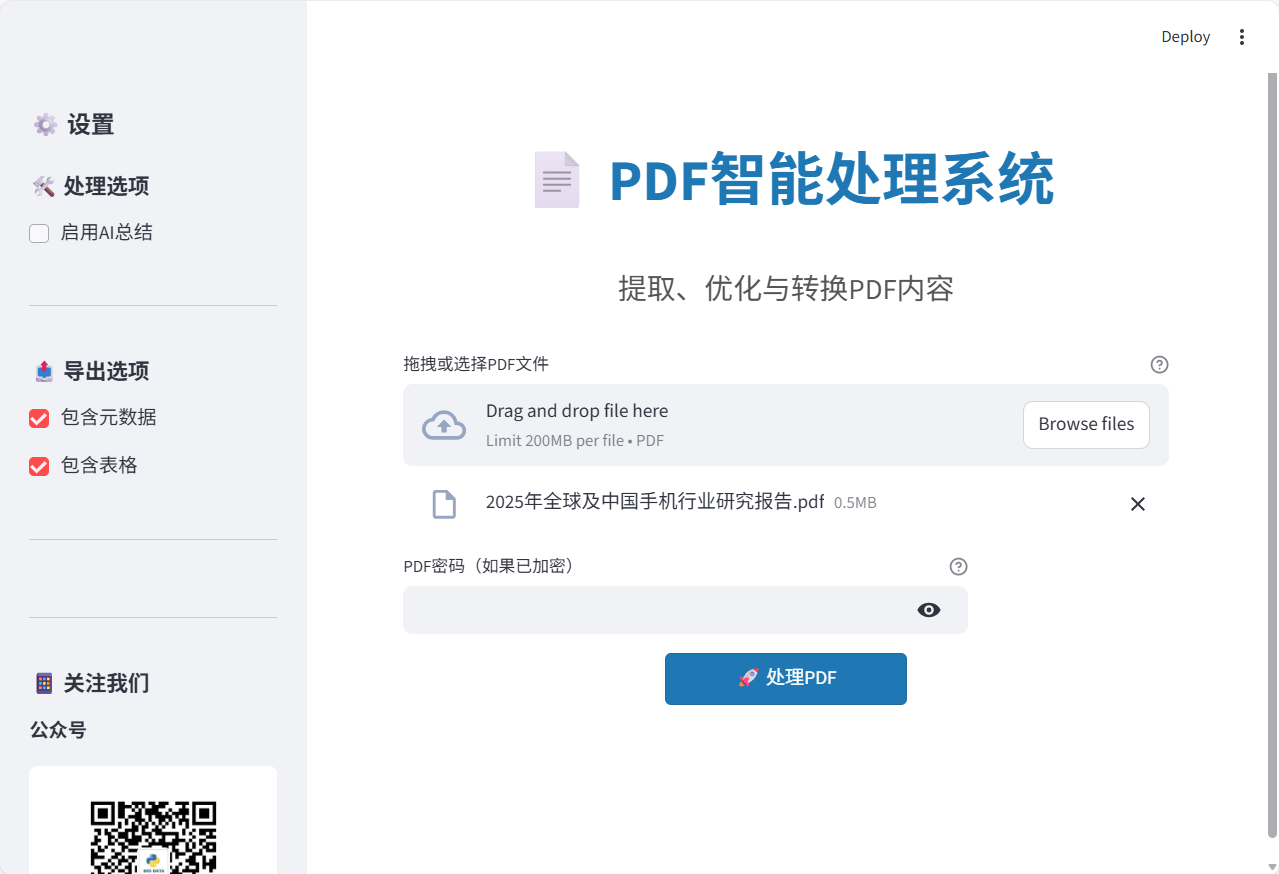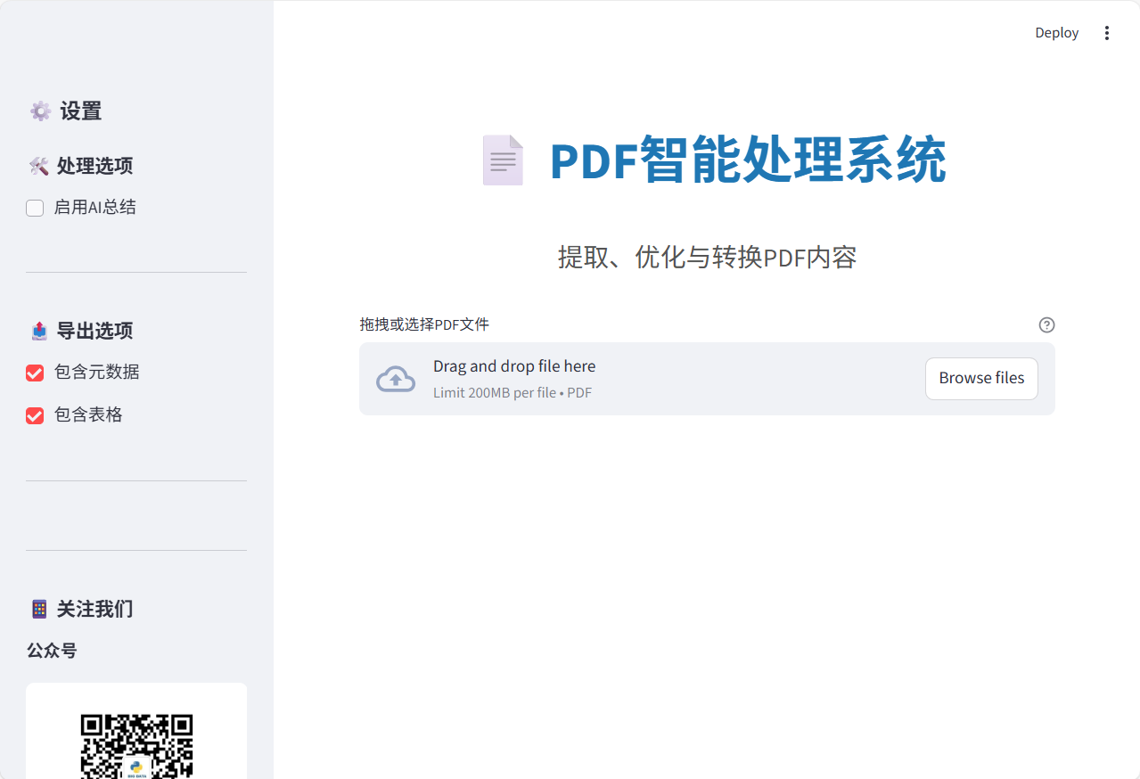 这个应用是基于streamlit开发的,在浏览器上打开使用,它支持的PDF操作包括: