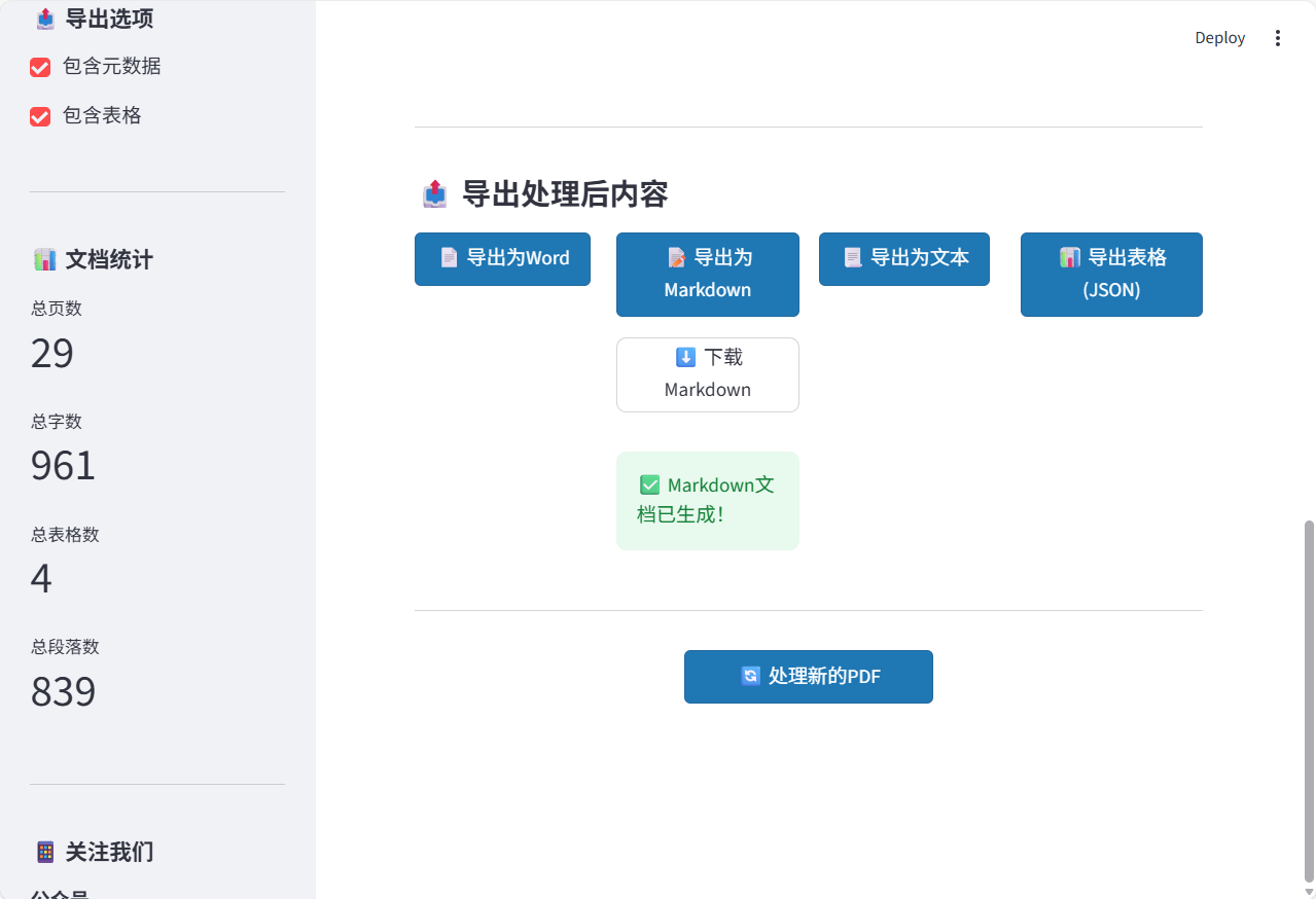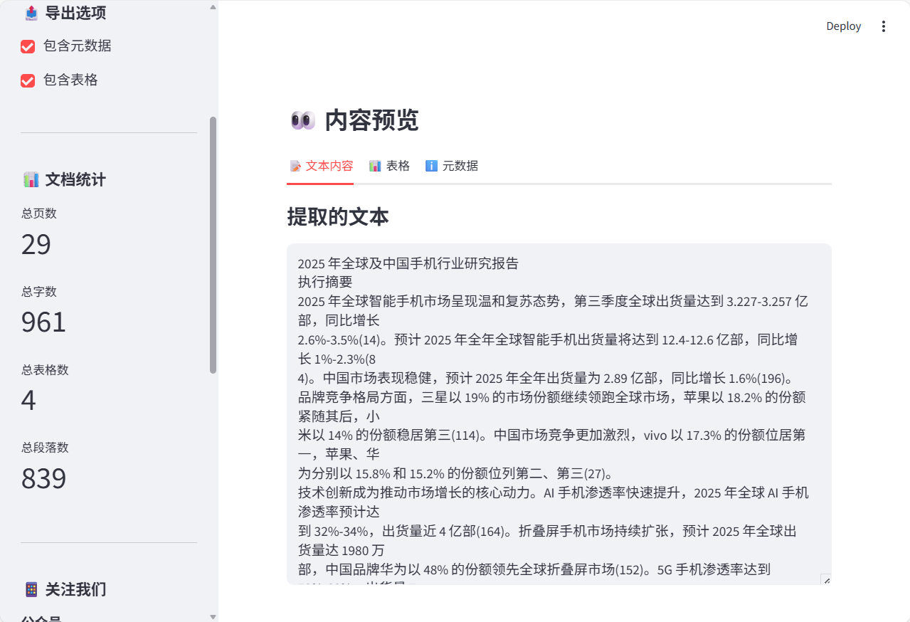 它就会将完整的文本提取出来,并显示PDF的基本信息。