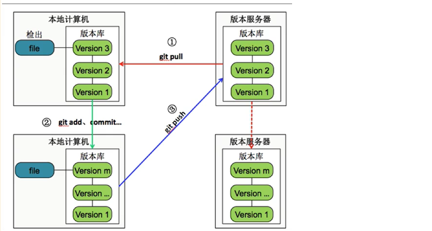 分布式版本控制系统(Distributed Version Control System,简称DVCS )会把服务器上的代码仓库完整地镜像下来。这样每个人的电脑上都有一份完整的服务器代码仓库的镜像,每一次的提取操作,实际上都是一次对代码仓库的完整备份。