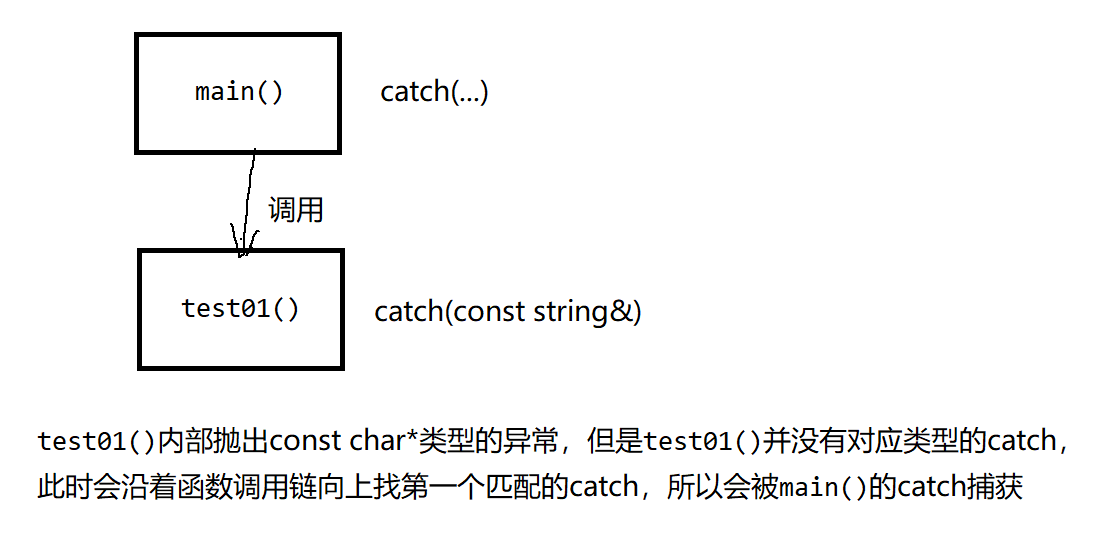 2.抛出异常在当前块未找到对应的catch,则会沿着函数调用链向上找第一个匹配的catch