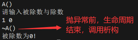 A a; // 抛出异常后,a的生命周期也随之结束,会调用其析构