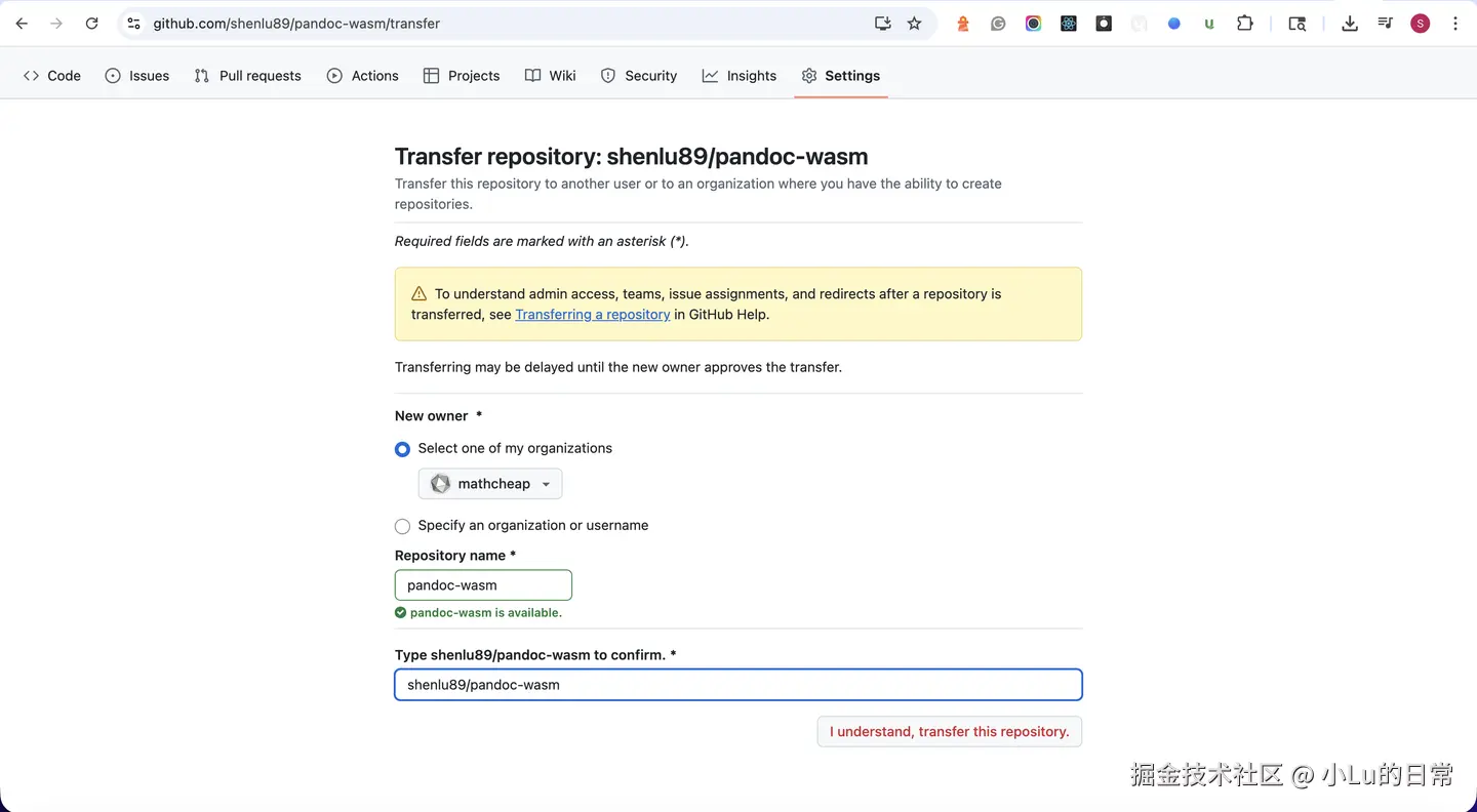 最近在筹划将 Mathcheap 的开源出来,之前已经开源了pandoc-wasm(将pandoc 编译成wasm版本的docker镜像)。但一直放在我自己的GitHub 账号下面,今天打算转移到 Mathcheap 的 GitHub 账号下面,为后续产品的开源做准备,好了话不多说,开始实操。