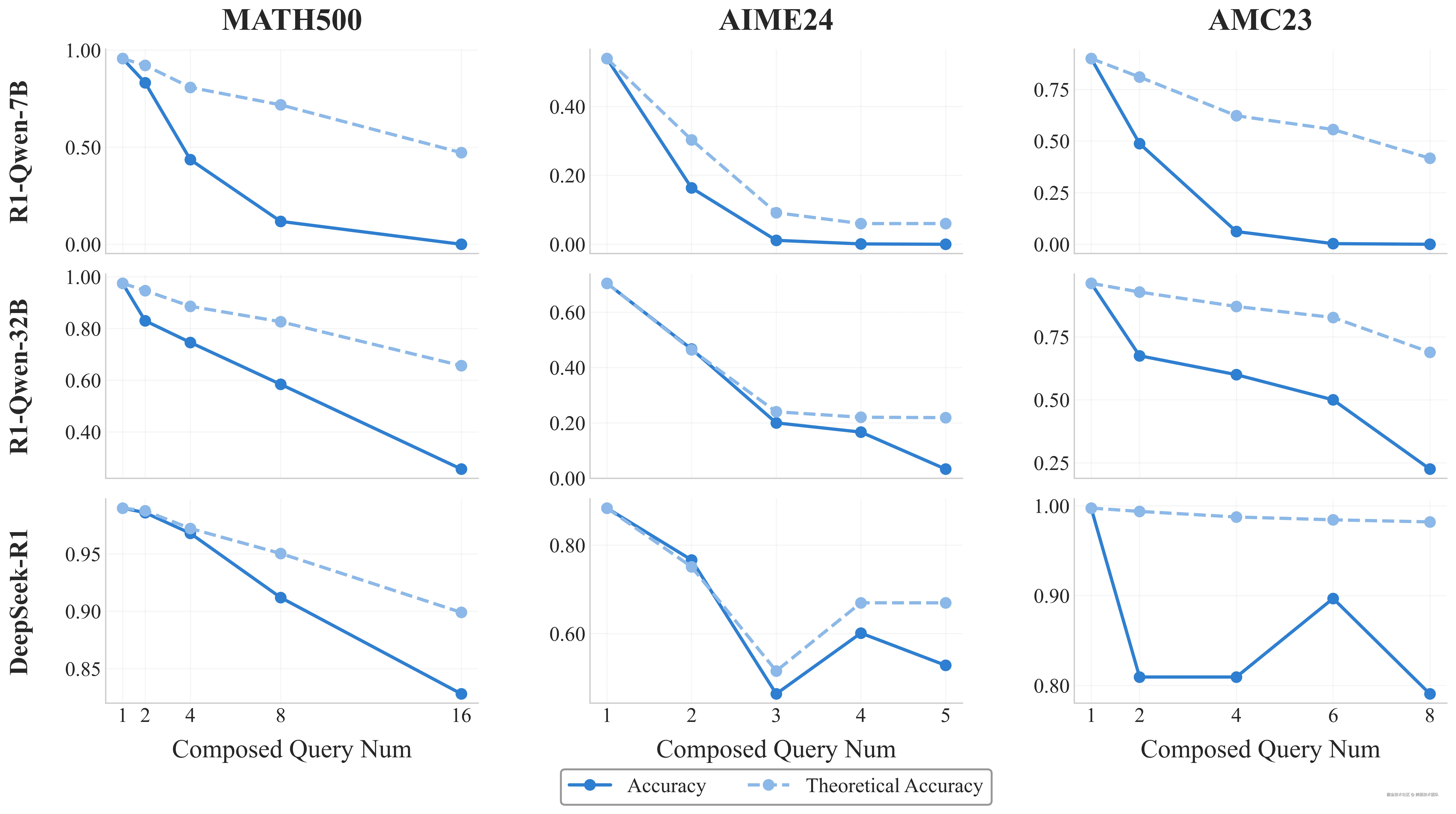 - 普遍性能退化:所有模型随问题数量增加均出现明显性能下降。DeepSeek-R1 在 AIME25 单问题场景准确率达 87.3%,但在 5 个组合问题场景下骤降至 24.6%。