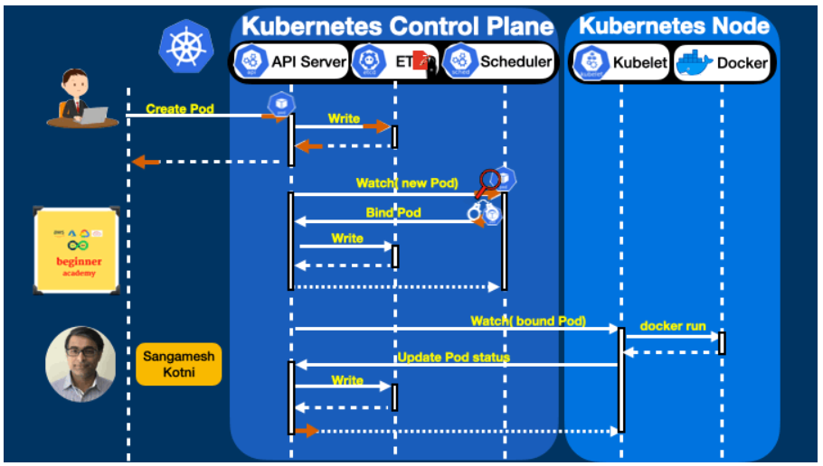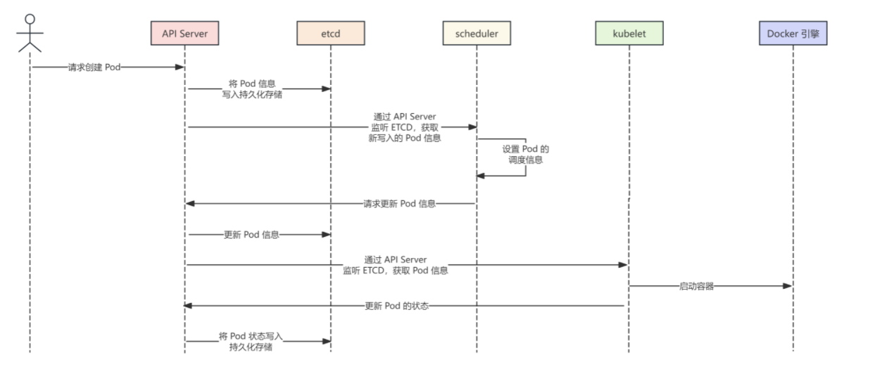 第五步: worker创建完成之后反馈给自身的kubelet, 再反馈给控制器的apiserver,apiserver又将pod的状态信息写入etcd。