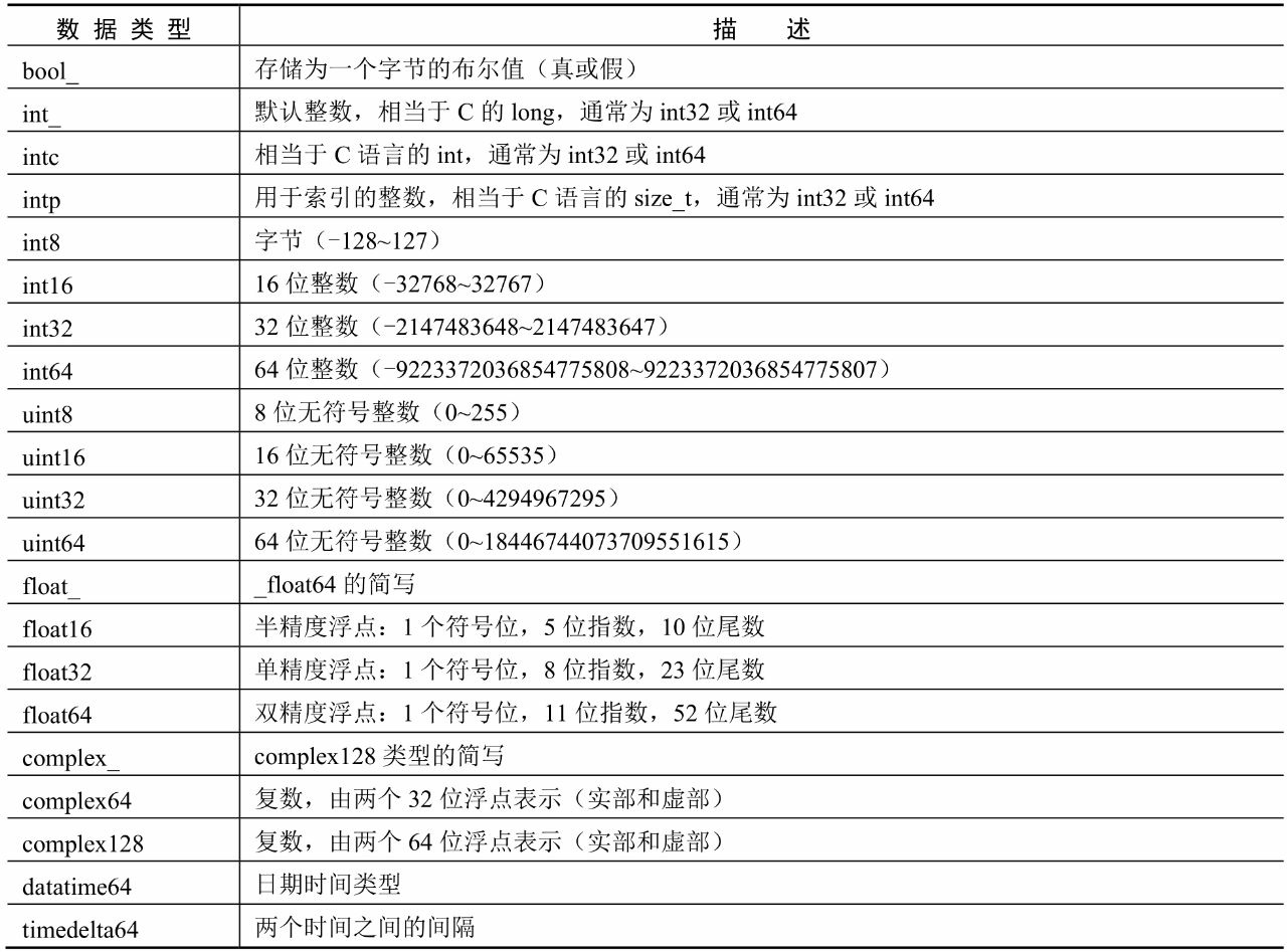 在对数组进行基本操作前,首先了解一下NumPy的数据类型。NumPy比Python增 加了更多种类的数值类型,如表4.1所示,为了区别于Python数据类型,NumPy中的 bool、int、float、complex等数据类型名称末尾都加了短下画线"_"。