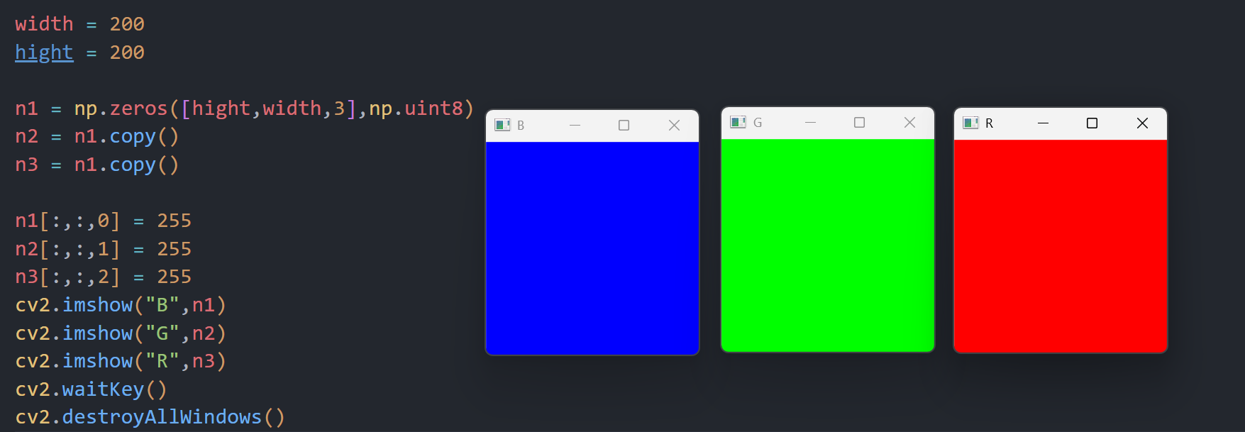 以上实例演示的都是用二维数组表示的黑白图像,而当显示生活中丰富多彩的颜色需 要引入光谱三基色的概念时,无法用二维数组表示,而要用到三维数组。OpenCV中彩色图像默认为BGR格式,彩色图像的第三个索引表示的就是蓝、绿、红3种颜色的分量。