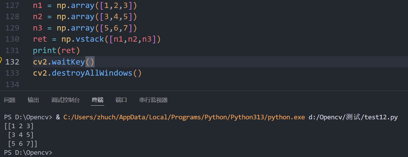 例子: 创建3个一维数组,将这3个数组进行垂直拼接