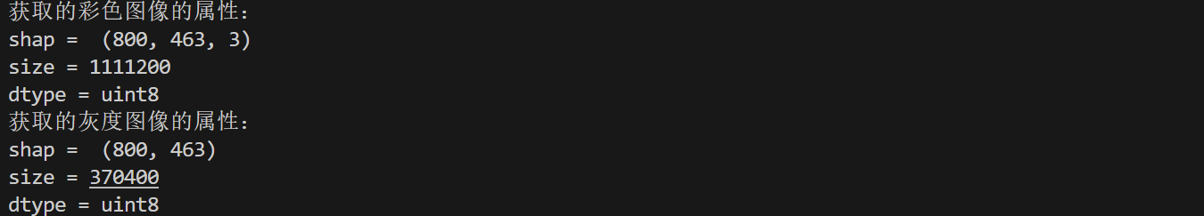 在处理图像的过程中,经常需要获取图像的大小、类型等图像属性。为此, OpenCV提供了shape、size和dtype 3个常用属性,具体含义分别如下。