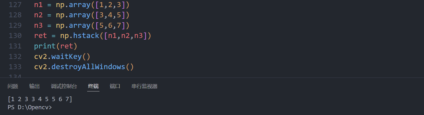 示例 :创建3个一维数组,将这3个数组进行水平拼接