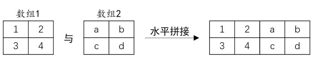 hstack()方法可以对数组进行水平拼接(或叫横向拼接),其语法如下: