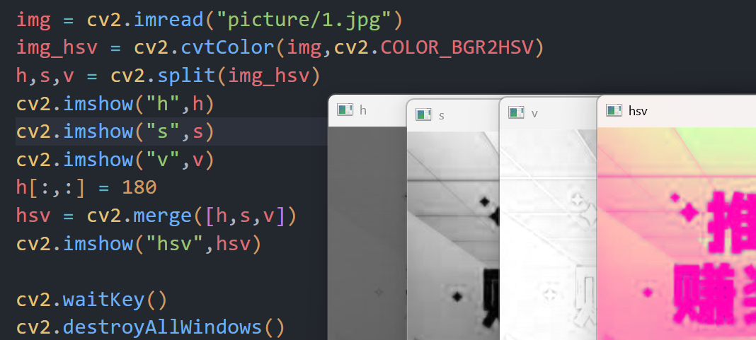 示例: 合并H通道图像、S通道图像和V通道图像。