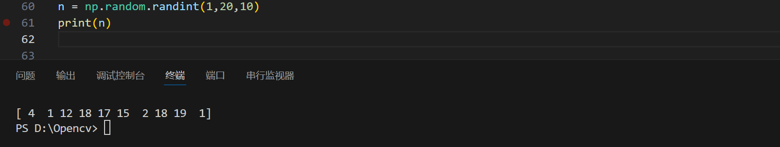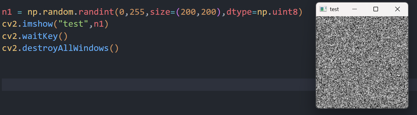 使用NumPy提供的random.randint()方法就可以创建随机数组,将随机值的取值范 围设定在0~256(即像素值范围),元素类型设定为无符号8位整数