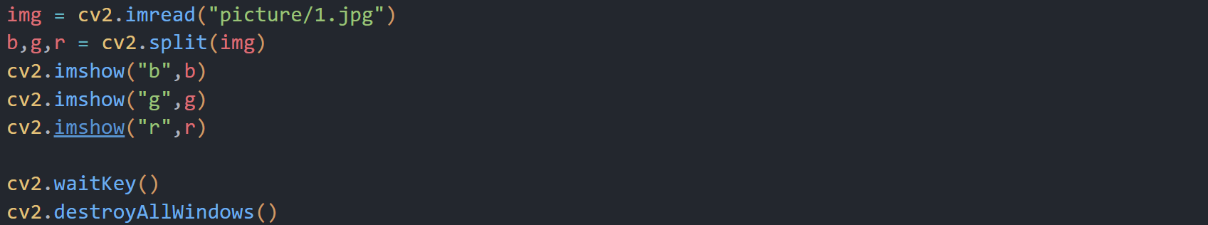 原因是当程序执行到cv2.imshow("B", b)时,原图像B、G、R这3个通道的值都会被 修改为B通道图像的值,即(b, b, b)。同理,当程序执行到cv2.imshow("G", g)和 cv2.imshow("R", r)时,原图像R、G、B这3个通道的值将依次被修改为G通道图像的值(g, g, g)和R通道图像的值(r, r, r)。对于BGR图像,只要B、G、R这3个通道的值都相 同,就可以得到灰度图像。