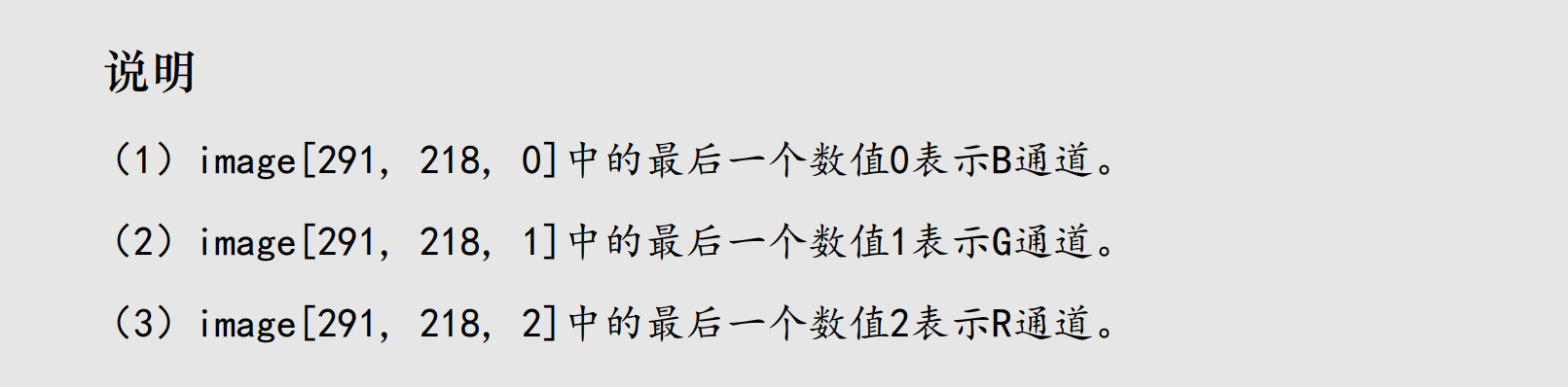 从上文能够知晓,在BGR色彩空间的图像中,每3个数值表示一个像素,这3个数值 分别表示蓝色、绿色和红色3种颜色分量,把每一种颜色分量所在的区域称作通道。那 么,OpenCV是如何获取指定位置上的像素的B通道、G通道和R通道的值呢?