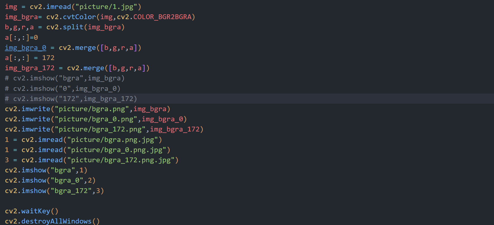 虽然在代码中已经调整了BGRA图像中A通道的值,但是显示图像的效果是一样的。 为了显示3幅图像的不同效果,需要使用imwrite()方法将3幅图像保存在D盘根目录下, 代码如下: