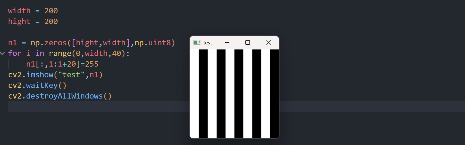 示例:先绘制纯黑图像作为背景,然后在循环中使用切片式索引操作绘制黑白间隔图像