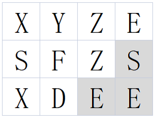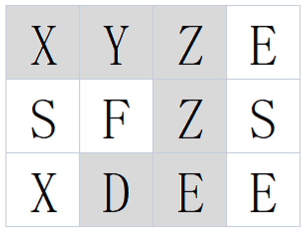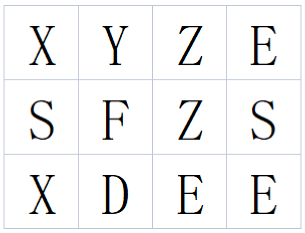 单词由相邻单元格的字母连接而成,相邻单元指的是上下左右相邻。同一单元格的字母不能多次使用。