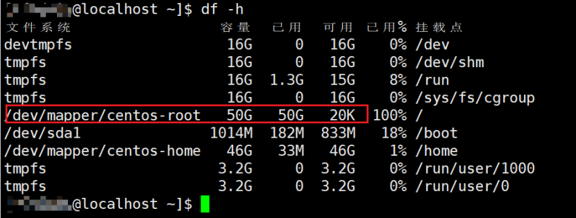 可以看到/dev/mapper/centos-root空间已用100%