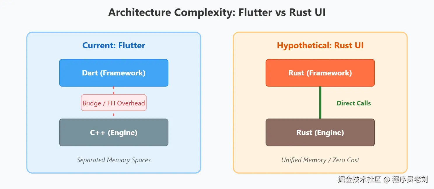 现实世界里更合理的做法是使用Dart这类高级语言作为UI主栈,同时在需要的地方把性能关键模块用Rust(或C++)实现,通过FFI嵌入。
