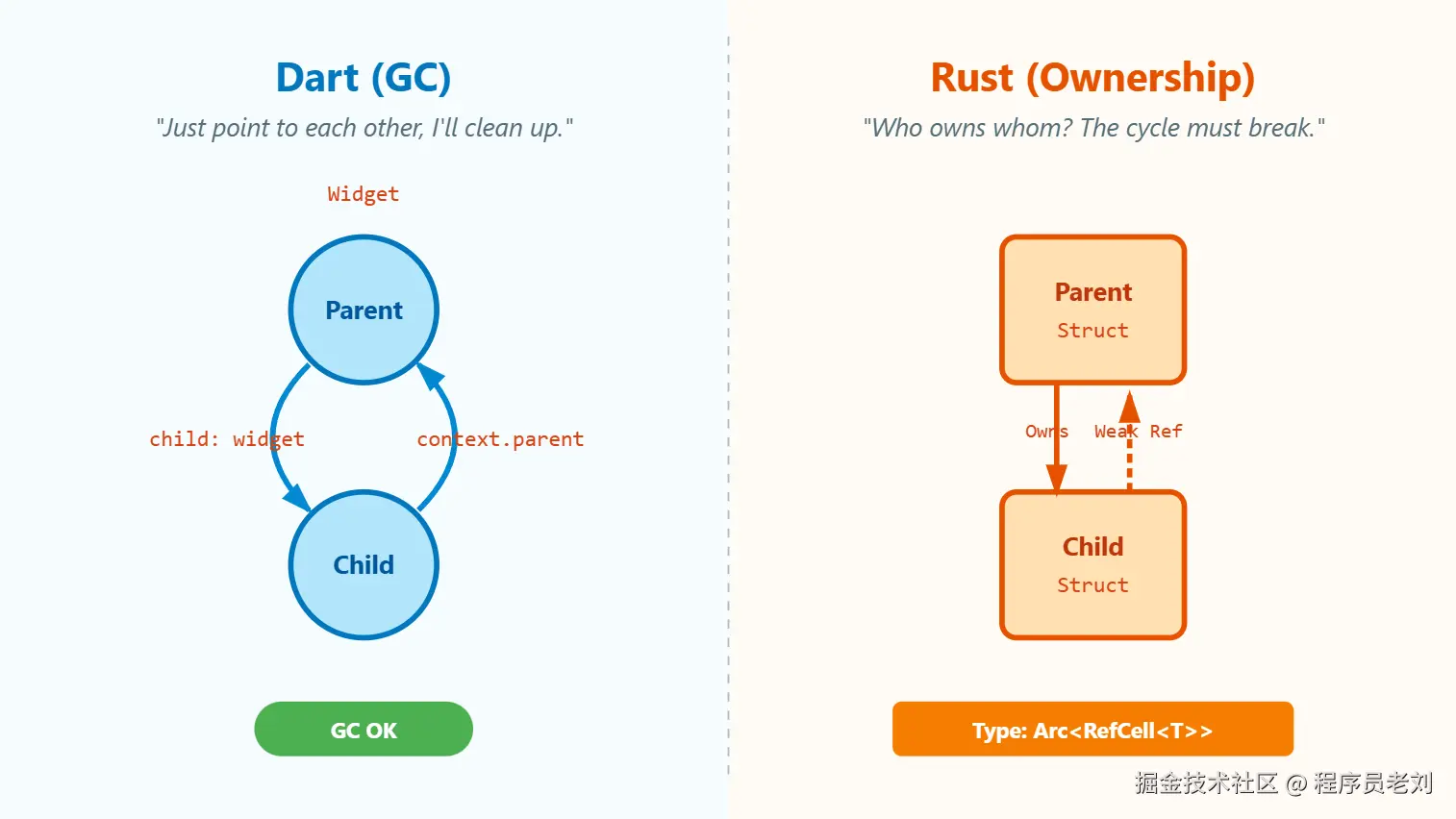 结果就是:干净的 Ownership 模型被迫降级到Arc<RefCell> / Arc<Mutex> + Weak 拆环,手动管理引用计数,几乎把 Java 那套 GC 思维又搬了回来。