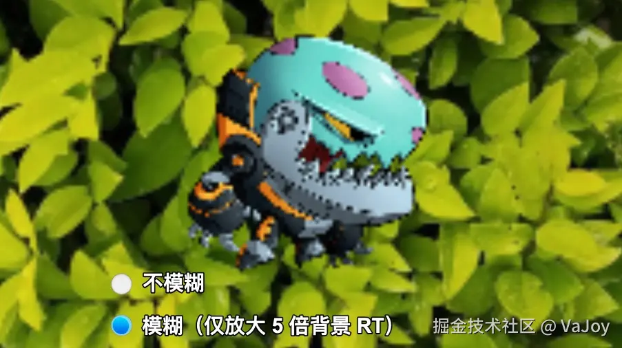 我们先继续维持上一节的「Render Texture 放大 + 着色器采样」的方案,不过我们把 RT 仅放大 2 倍(减少失真),并将着色器单次采样的数量从 10 次增加到 20 次(让模糊效果更细腻),效果如下: