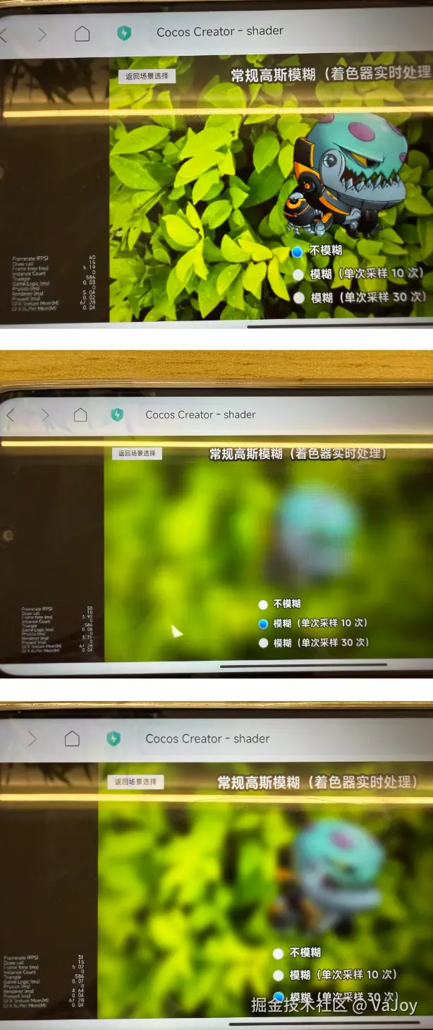 就能看出着色器在单次 DrawCall 里采样的次数所造成的 GPU 负载,会是线性提升的关系。 这兴许也是 Cocos Creator 没有内置高斯模糊组件的原因 ------ 怕被滥用导致游戏性能崩溃。