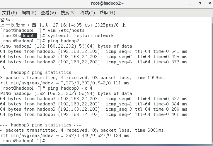 确保三台虚拟机的 IP 固定(如通过/etc/sysconfig/network-scripts/ifcfg-eth0配置静态 IP),且互相能 ping 通。