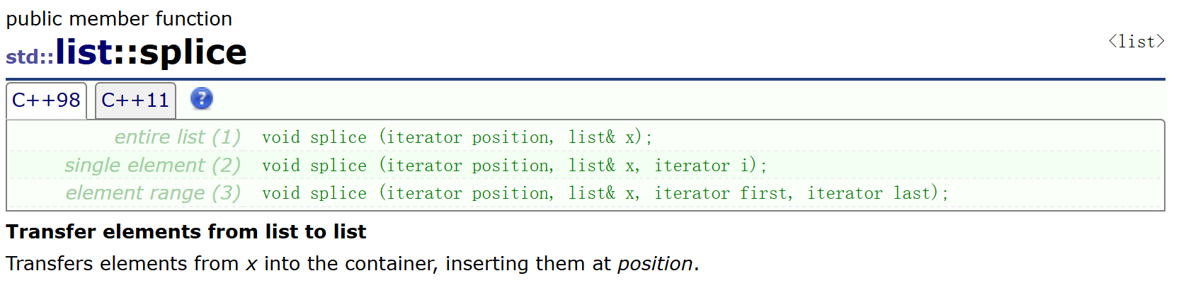 第二个问题,如果找到key了,那么如何更新key对应值的位置呢?方案1:erase+push_front,更新迭代器,原迭代器失效。方案2:转移节点,标准库的list提供了专门的一个接口(如下图)。