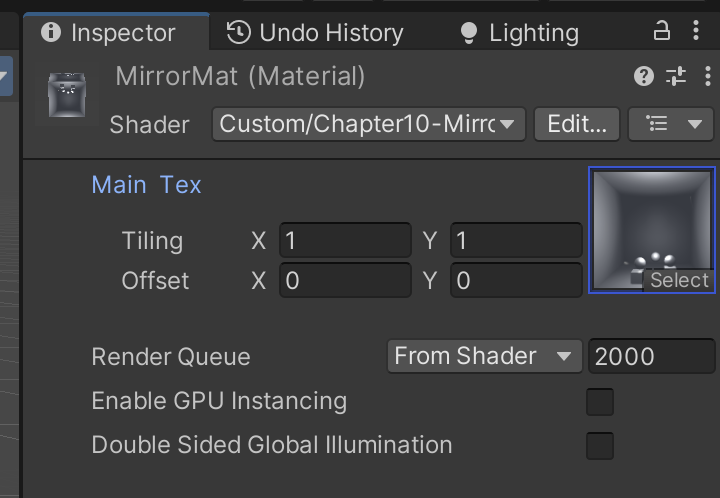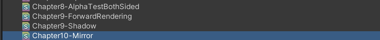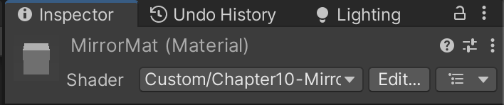 (3)新建一个Unity Shader。在本书资源中,该Shader名为Chapter10-Mirror。把新的Shader赋给第2步中创建的材质。