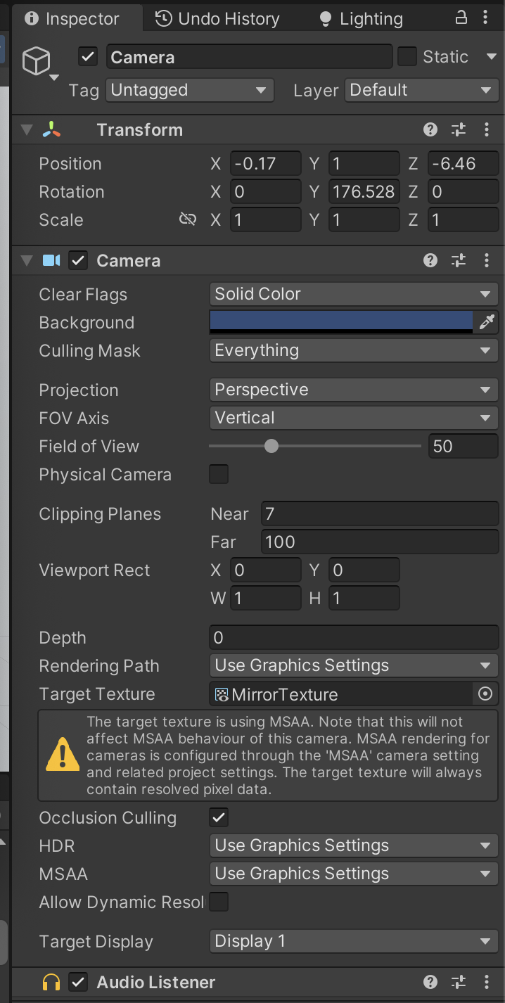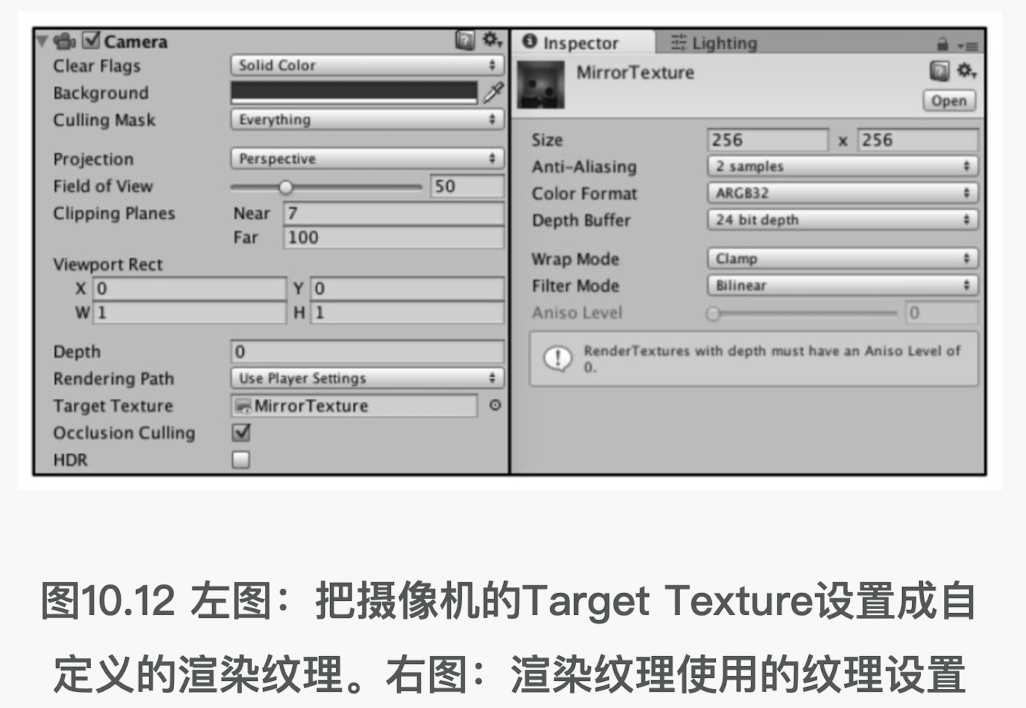 (8)最后,为了得到从镜子出发观察到的场景图像,我们还需要创建一个摄像机,并调整它的位置、裁剪平面、视角等,使得它的显示图像是我们希望的镜子图像。由于这个摄像机不需要直接显示在屏幕上,而是用于渲染到纹理。因此,我们把第7步中创建的MirrorTexture拖曳到该摄像机的Target Texture上。图10.12显示了摄像机面板和渲染纹理的相关设置。