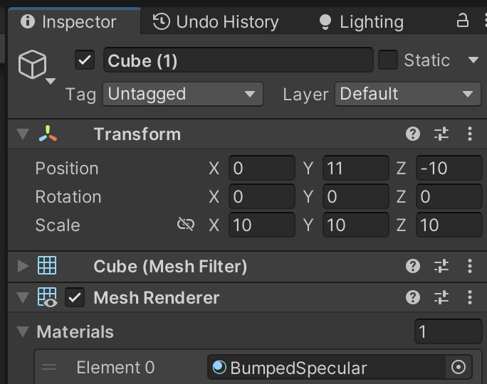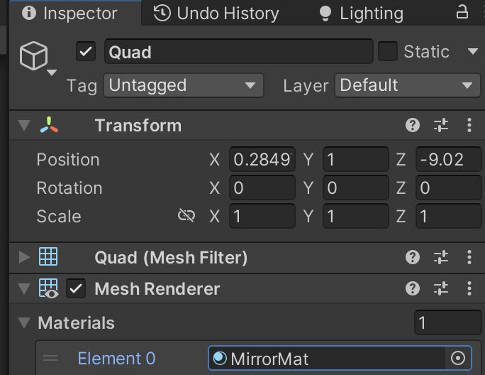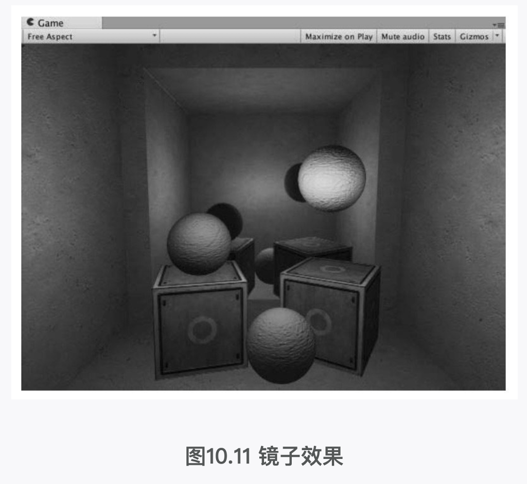 保存后返回场景,并把我们创建的MirrorTexture渲染纹理拖曳到材质的Main Tex属性中,就可以得到图10.11中的效果。