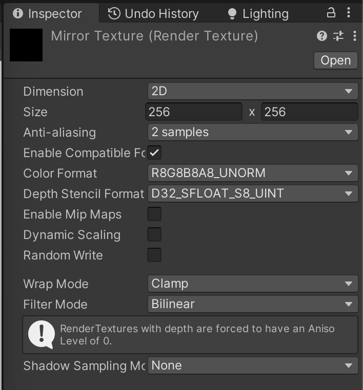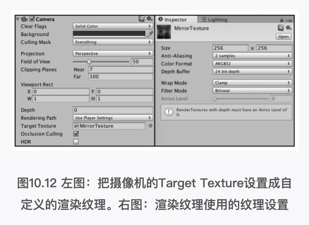 (7)在Project视图下创建一个渲染纹理(右键单击Create → Render Texture),在本书资源中,该渲染纹理名为MirrorTexture。它使用的纹理设置如图10.12右图所示。