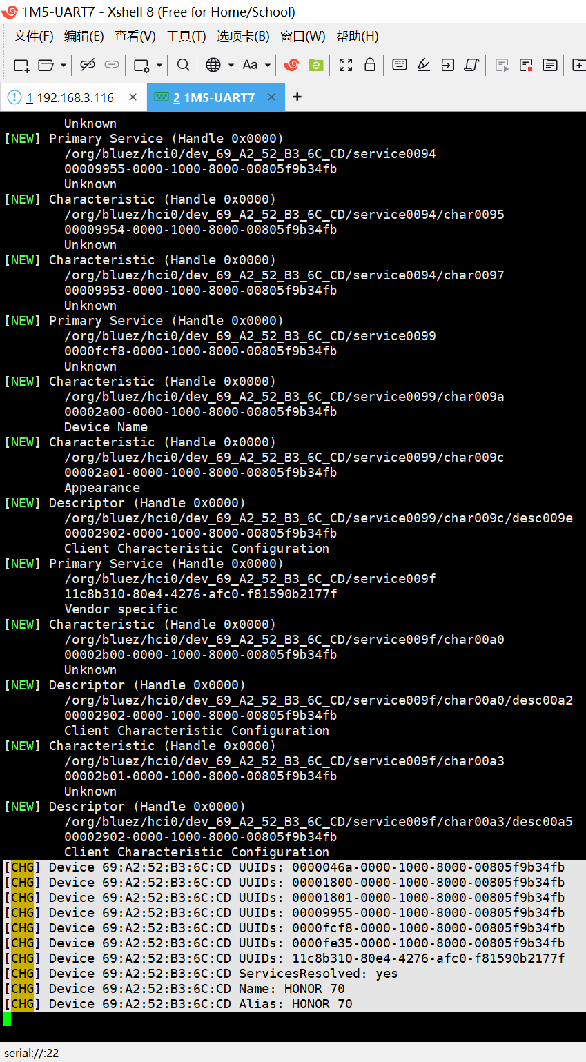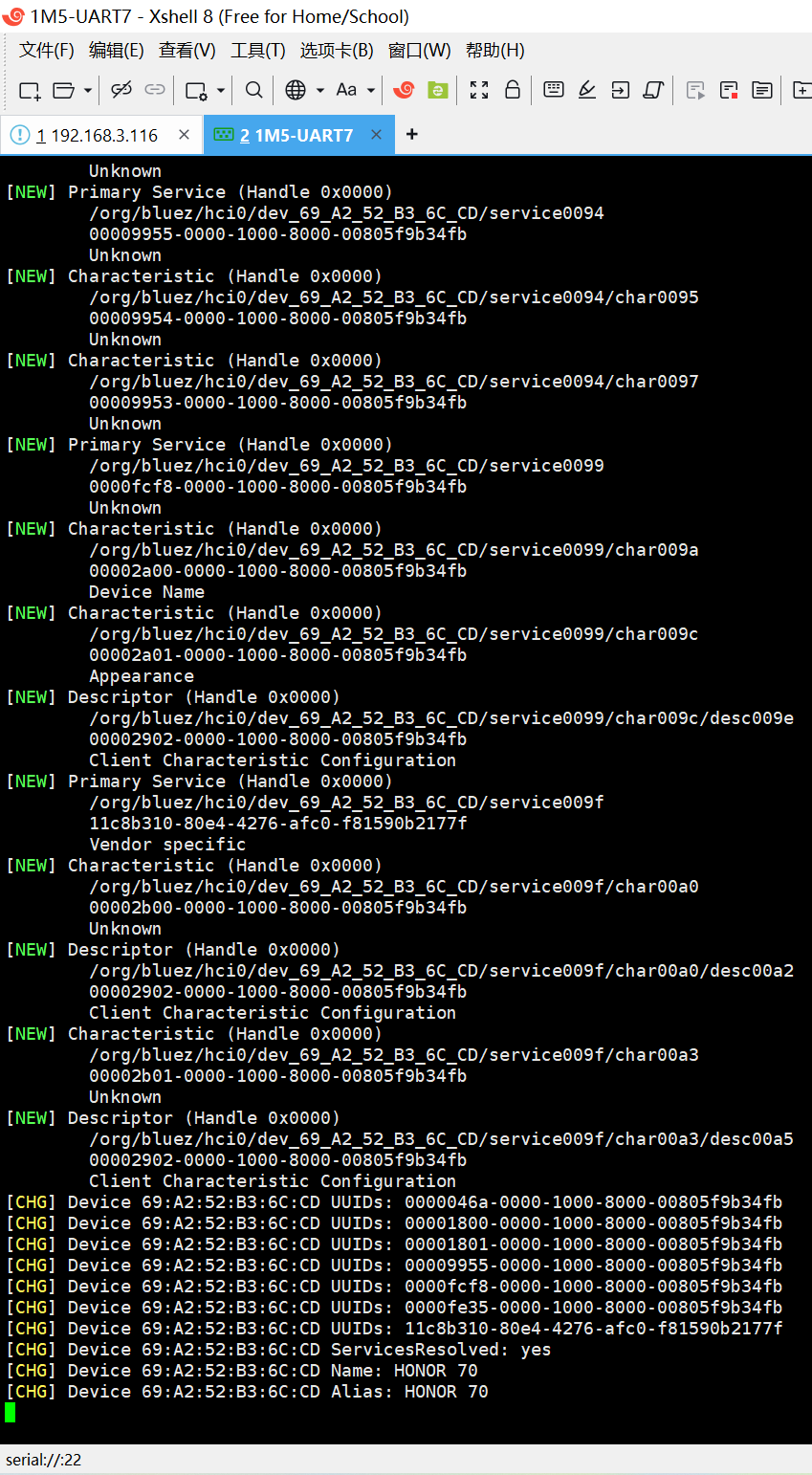 CHG\] Device 79:BF:3F:A8:61:05 UUIDs: 00001800-0000-1000-8000-00805f9b34fb \[CHG\] Device 79:BF:3F:A8:61:05 UUIDs: 00001801-0000-1000-8000-00805f9b34fb \[CHG\] Device 79:BF:3F:A8:61:05 UUIDs: 00001805-0000-1000-8000-00805f9b34fb \[CHG\] Device 79:BF:3F:A8:61:05 UUIDs: 0000180a-0000-1000-8000-00805f9b34fb \[CHG\] Device 79:BF:3F:A8:61:05 UUIDs: 0000180f-0000-1000-8000-00805f9b34fb \[CHG\] Device 79:BF:3F:A8:61:05 UUIDs: 7905f431-b5ce-4e99-a40f-4b1e122d00d0 \[CHG\] Device 79:BF:3F:A8:61:05 UUIDs: 89d3502b-0f36-433a-8ef4-c502ad55f8dc \[CHG\] Device 79:BF:3F:A8:61:05 UUIDs: 9fa480e0-4967-4542-9390-d343dc5d04ae \[CHG\] Device 79:BF:3F:A8:61:05 UUIDs: d0611e78-bbb4-4591-a5f8-487910ae4366 \[CHG\] Device 79:BF:3F:A8:61:05 ServicesResolved: yes \[CHG\] Device 79:BF:3F:A8:61:05 Name: iPhone \[CHG\] Device 79:BF:3F:A8:61:05 Alias: iPhone \[CHG\] Device 79:BF:3F:A8:61:05 Appearance: 0x0040 \[CHG\] Device 79:BF:3F:A8:61:05 Icon: phone \[CHG\] Device 79:BF:3F:A8:61:05 ServicesResolved: no \[CHG\] Device 79:BF:3F:A8:61:05 Connected: no \[CHG\] Device 79:BF:3F:A8:61:05 Connected: yes \[CHG\] Device 79:BF:3F:A8:61:05 Connected: no \[CHG\] Device 79:BF:3F:A8:61:05 Connected: yes 复制Error已复制 连接成功 可通过运行脚本来进行测试 /rp_test/bt/test_bt_ble_clinet.sh             详细的LOG: \[BEGIN\] 2025/11/29 9:23:13 @@@ᾄDR 3488111f83 cym 24/04/12-12:49:26,fwver: v1.17 LPDDR4X, 2112MHz channel\[0\] BW=16 Col=10 Bk=8 CS0 Row=16 CS1 Row=16 CS=2 Die BW=16 Size=2048MB channel\[1\] BW=16 Col=10 Bk=8 CS0 Row=16 CS1 Row=16 CS=2 Die BW=16 Size=2048MB channel\[2\] BW=16 Col=10 Bk=8 CS0 Row=16 CS1 Row=16 CS=2 Die BW=16 Size=2048MB channel\[3\] BW=16 Col=10 Bk=8 CS0 Row=16 CS1 Row=16 CS=2 Die BW=16 Size=2048MB Manufacturer ID:0x13 CH0 RX Vref:28.5%, TX Vref:23.8%,25.8%DQ rds: h0 l0, h0 l0, h0 l1, h4 l0, h0 l0, h2 l0, h0 l0, h0 l0, h0 l0, h2 l0, h0 l0, h0 l1, h3 l0, h0 l0, h1 l0, h1 l0, CH1 RX Vref:28.3%, TX Vref:24.8%,26.8%DQ rds: h1 l0, h3 l0, h3 l0, h0 l0, h5 l0, h2 l0, h2 l0, h0 l1, h0 l1, h1 l0, h1 l0, h1 l0, h0 l0, h3 l0, h1 l0, h5 l0, CH2 RX Vref:29.7%, TX Vref:25.8%,27.8%DQ rds: h1 l0, h0 l0, h0 l0, h0 l1, h0 l0, h0 l0, h2 l0, h0 l0, h2 l0, h0 l0, h4 l0, h2 l0, h3 l0, h1 l0, h0 l0, h3 l0, CH3 RX Vref:28.9%, TX Vref:24.8%,24.8%DQ rds: h0 l0, h2 l0, h2 l0, h0 l0, h1 l0, h0 l0, h4 l0, h0 l0, h0 l0, h0 l0, h1 l0, h1 l0, h1 l0, h0 l0, h0 l0, h1 l0, stride=0x2, ddr_config=0x4 hash ch_mask0-1 0x20 0x40, bank_mask0-3 0xa00 0x1400 0x2800 0x0, rank_mask0 0x401000 change to F1: 528MHz change to F2: 1068MHz change to F3: 1560MHz change to F0: 2112MHz out U-Boot SPL board init U-Boot SPL 2017.09-ge4e124926e-230922 #lxh (Sep 25 2023 - 10:58:38), fwver: v1.13 unknown raw ID 0 0 0 unrecognized JEDEC id bytes: 00, 00, 00 Trying to boot from MMC2 MMC: no card present mmc_init: -123, time 1 spl: mmc init failed with error: -123 Trying to boot from MMC1 SPL: A/B-slot: _a, successful: 0, tries-remain: 7 Trying fit image at 0x4000 sector ## Verified-boot: 0 ## Checking atf-1 0x00040000 (gzip @0x00240000) ... sha256(1e426f92e3...) + sha256(64122e141b...) + OK ## Checking uboot 0x00200000 (gzip @0x00400000) ... sha256(a358771c80...) + sha256(f927a08b0a...) + OK ## Checking fdt 0x00348348 ... sha256(a434b1c4fe...) + OK ## Checking atf-2 0xff100000 ... sha256(ce8968e34f...) + OK ## Checking atf-3 0x000f0000 ... sha256(ce48b69fdd...) + OK ## Checking optee 0x08400000 (gzip @0x08600000) ... sha256(e1ef4db9af...) + sha256(b866e4e4a1...) + OK Jumping to U-Boot(0x00200000) via ARM Trusted Firmware(0x00040000) Total: 94.108/302.743 ms INFO: Preloader serial: 2 NOTICE: BL31: v2.3():v2.3-765-g588059758:derrick.huang, fwver: v1.46 NOTICE: BL31: Built : 18:13:16, Apr 29 2024 INFO: spec: 0x1 INFO: code: 0x88 INFO: ext 32k is not valid INFO: ddr: stride-en 4CH INFO: GICv3 without legacy support detected. INFO: ARM GICv3 driver initialized in EL3 INFO: valid_cpu_msk=0xff bcore0_rst = 0x0, bcore1_rst = 0x0 INFO: l3 cache partition cfg-0 INFO: system boots from cpu-hwid-0 INFO: bypass memory repair INFO: idle_st=0x21fff, pd_st=0x11fff9, repair_st=0xfff70001 INFO: dfs DDR fsp_params\[0\].freq_mhz= 2112MHz INFO: dfs DDR fsp_params\[1\].freq_mhz= 528MHz INFO: dfs DDR fsp_params\[2\].freq_mhz= 1068MHz INFO: dfs DDR fsp_params\[3\].freq_mhz= 1560MHz INFO: BL31: Initialising Exception Handling Framework INFO: BL31: Initializing runtime services INFO: BL31: Initializing BL32 I/TC: I/TC: OP-TEE version: 3.13.0-791-g185dc3c92 #hisping.lin (gcc version 10.2.1 20201103 (GNU Toolchain for the A-profile Architecture 10.2-2020.11 (arm-10.16))) #2 Tue Apr 16 11:16:18 CST 2024 aarch64, fwver: v1.16 I/TC: OP-TEE memory: TEEOS 0x200000 TA 0xc00000 SHM 0x200000 I/TC: Primary CPU initializing I/TC: Primary CPU switching to normal world boot INFO: BL31: Preparing for EL3 exit to normal world INFO: Entry point address = 0x200000 INFO: SPSR = 0x3c9 U-Boot 2017.09 (Nov 26 2025 - 21:35:26 +0800) Model: Rockchip RK3588 Evaluation Board MPIDR: 0x0 PreSerial: 2, raw, 0xfeb50000 DRAM: 8 GiB Sysmem: init Relocation Offset: eda15000 Relocation fdt: eb9fa020 - eb9fecd8 CR: M/C/I Using default environment optee api revision: 2.0 mmc@fe2c0000: 1, mmc@fe2e0000: 0 Bootdev(atags): mmc 0 MMC0: HS400 Enhanced Strobe, 200Mhz PartType: EFI TEEC: Waring: Could not find security partition DM: v2 boot mode: None RESC: 'boot', blk@0x0001b0d0 resource: sha256+ FIT: no signed, no conf required DTB: rk-kernel.dtb HASH(c): OK usb dr_mode not found usb dr_mode not found I2c0 speed: 100000Hz vsel-gpios- not found! en-gpios- not found! vdd_cpu_big0_s0 800000 uV vsel-gpios- not found! en-gpios- not found! vdd_cpu_big1_s0 800000 uV I2c1 speed: 100000Hz vsel-gpios- not found! en-gpios- not found! vdd_npu_s0 800000 uV spi2: RK806: 2 ON=0x80, OFF=0x00 vdd_gpu_s0 750000 uV vdd_cpu_lit_s0 init 800000 uV vdd_log_s0 750000 uV vdd_vdenc_s0 init 750000 uV vdd_ddr_s0 850000 uV Device 'gpio@fd8a0000': seq 0 is in use by 'gpio@fd8a0000' get vp0 plane mask:0x5, primary id:2, cursor_plane:-1, fr