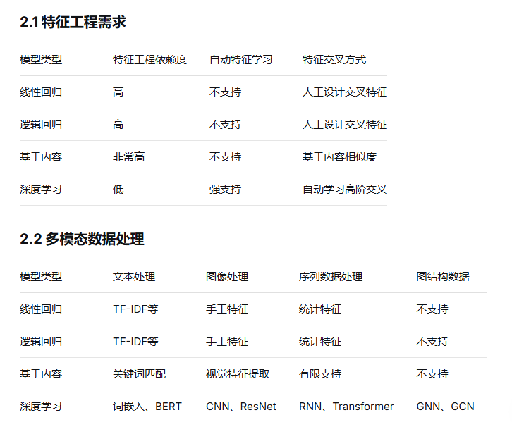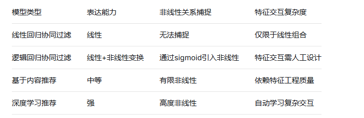 深度学习推荐模型与基于内容推荐以及与传统基于线性回归、逻辑回归协同过滤算法的对比:
