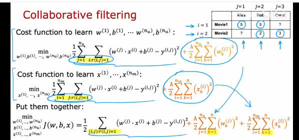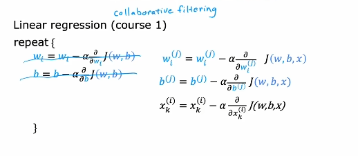 第三个代价函数是两个一起,同时进行训练w,b,x,这就是协同过滤算法。同时对三个参数进行梯度下降,最小化代价函数。