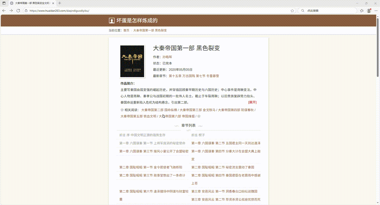 本文实现通过基于selenium框架的python自动化脚本,实现长篇历史小说《大秦帝国》本地化下载,效果如下:
