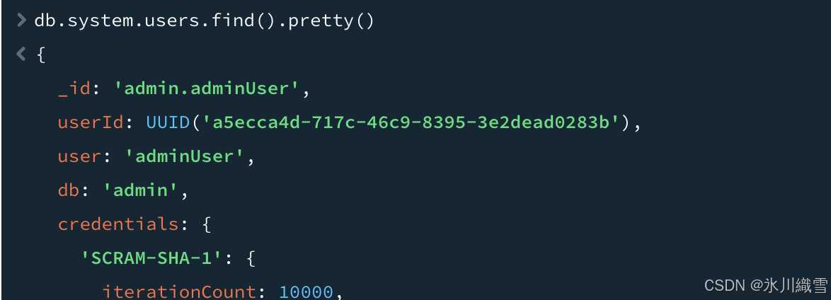 输入 db.system.users.find().pretty() 可以查看创建的用户: