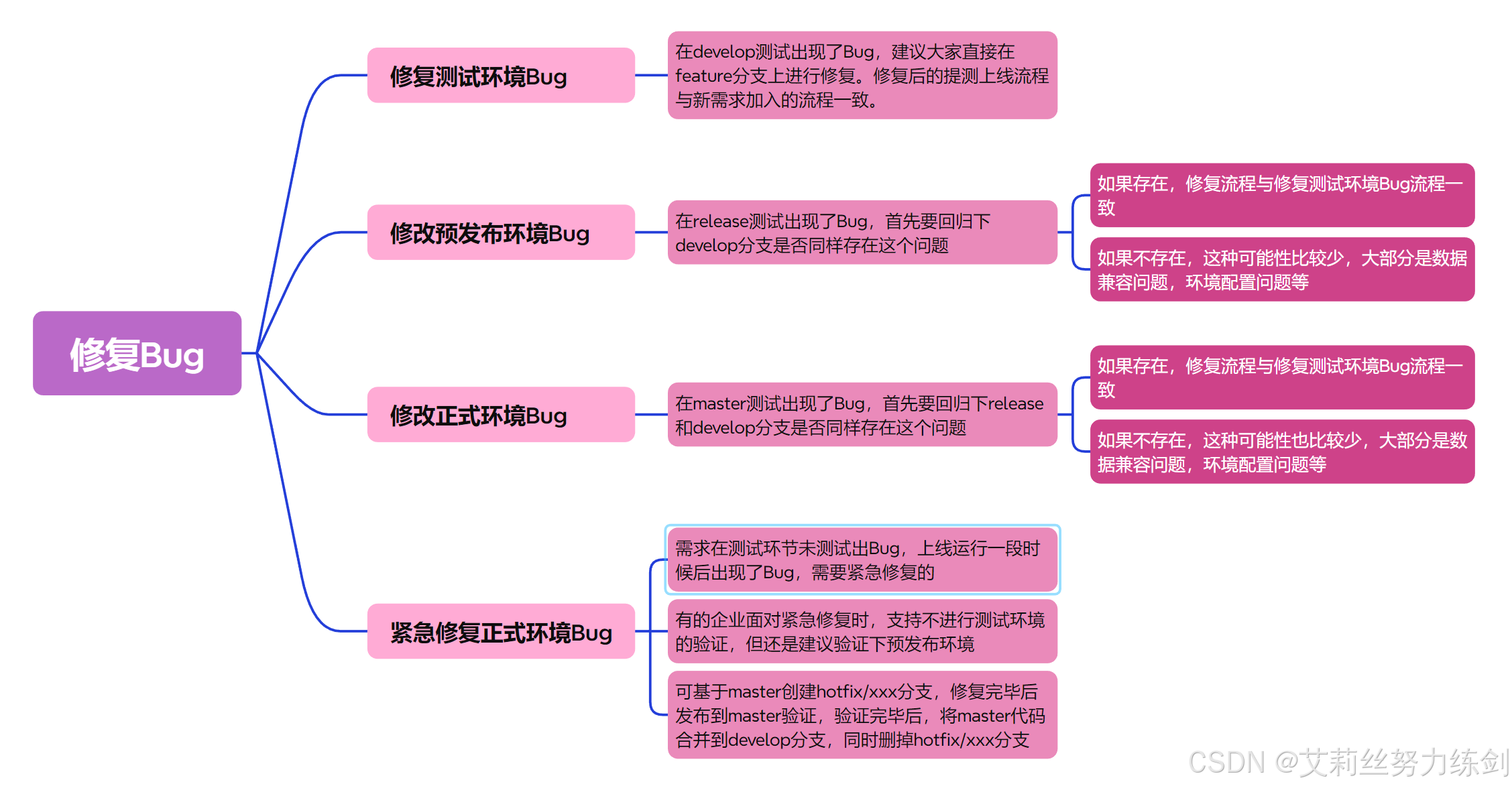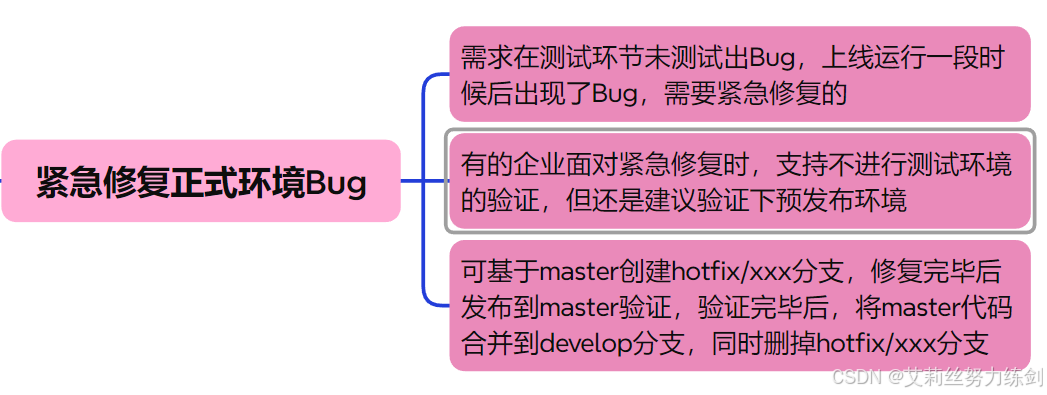 (1)hotfix分支为线上bug修复分支或叫补丁分支,主要用于对线上的版本进行bug修复。**当线上出现紧急问题需要马上修复时,**需要基于master分支创建hotfix分支;