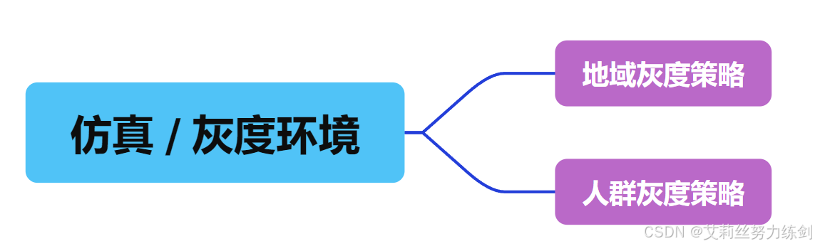 对于规模稍微大点的公司来说可不止这么几个环境,比如项目正式上线前还存在仿真 / 灰度环境(灰度机器,有策略:让某个地区的人先来访问,比如北京、上海...... ~> 让用户帮我们测试) ,如果这个地区的用户使用起来感觉没有问题,再推向全国------地域灰度策略,还有人群灰度策略:比如某个群体,可以是青少年、老年人、女性等等,如下图所示------