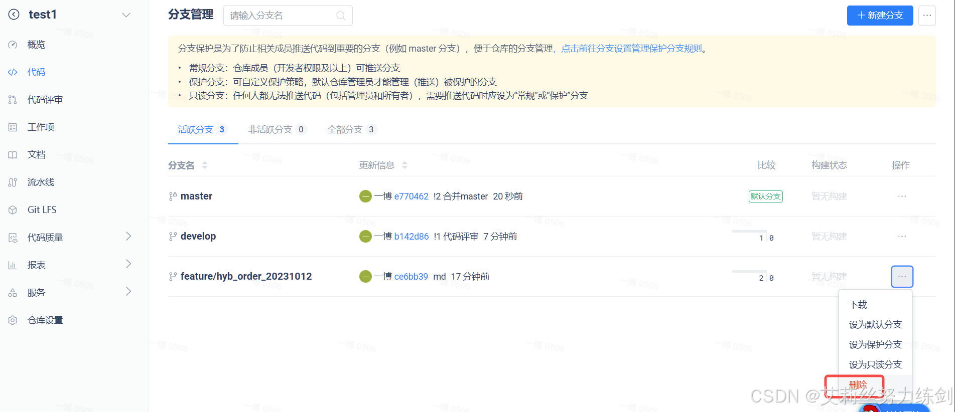 5.1.4 测试通过后,便可删除feature/xxx分值