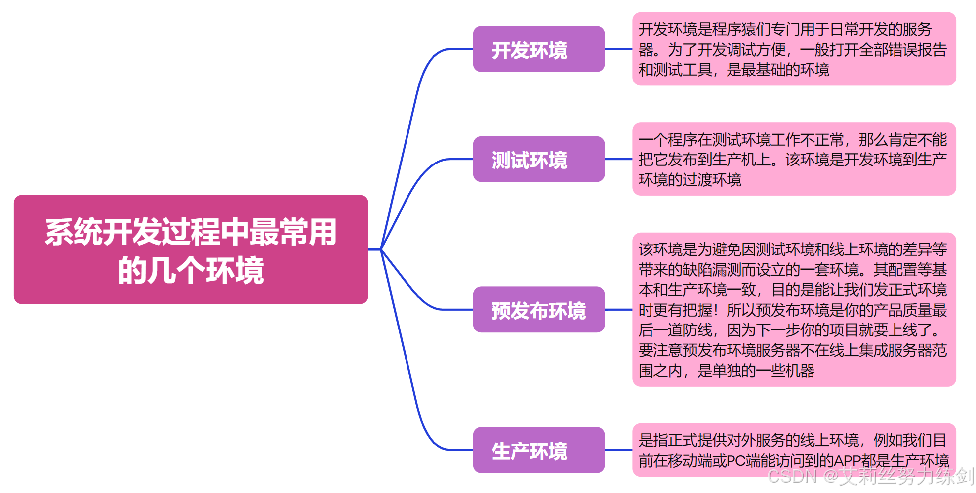 这几个环境也可以说是**系统开发的三个重要阶段:**开发 ~> 测试 ~> 上线,用一张图进行总结: