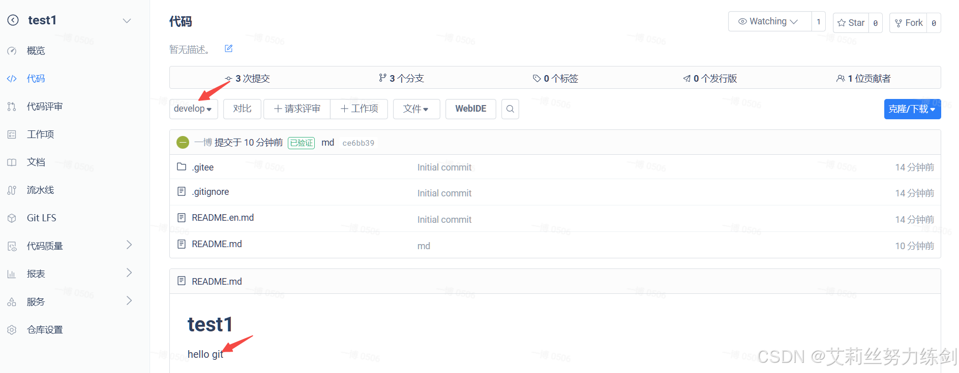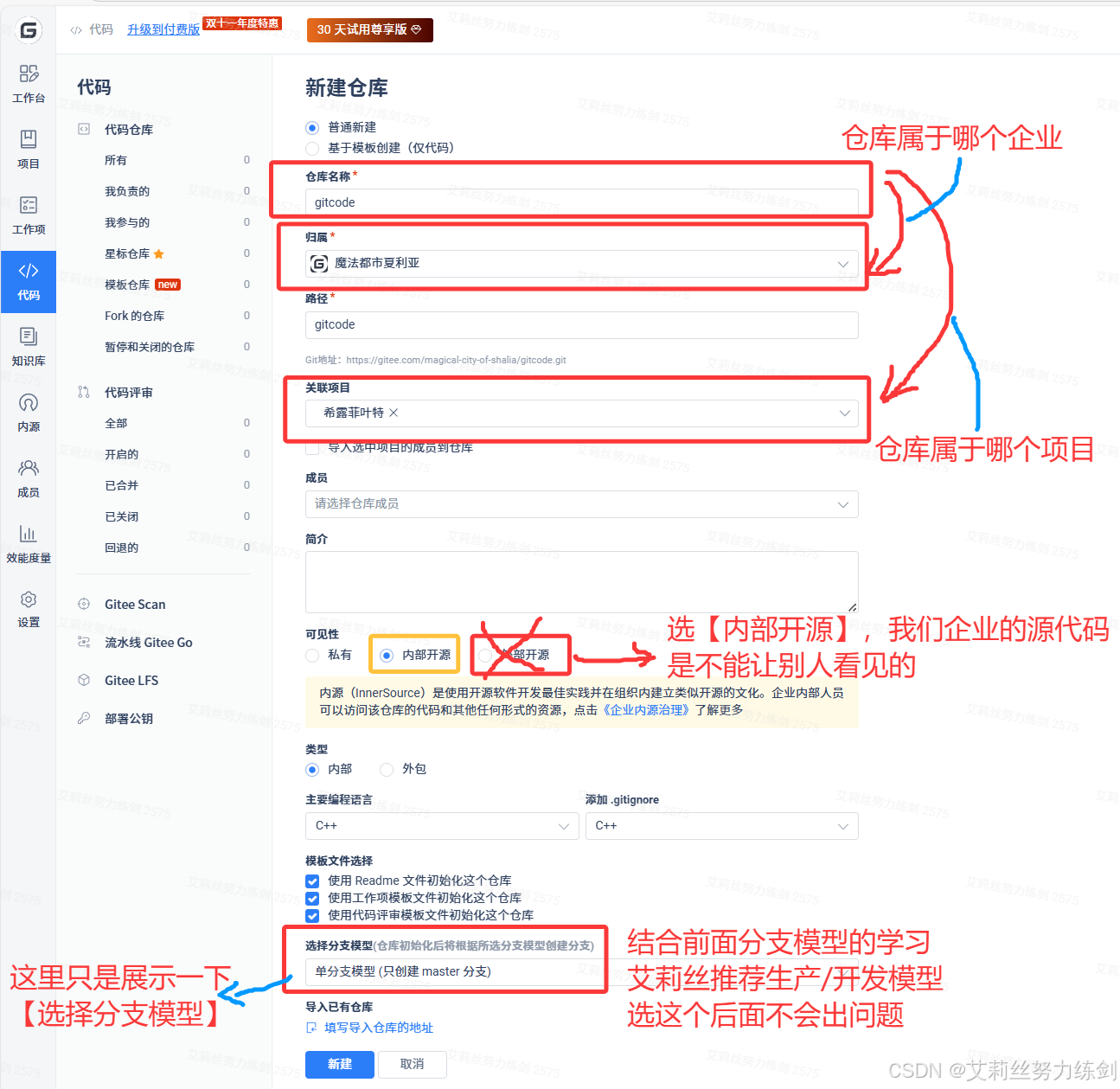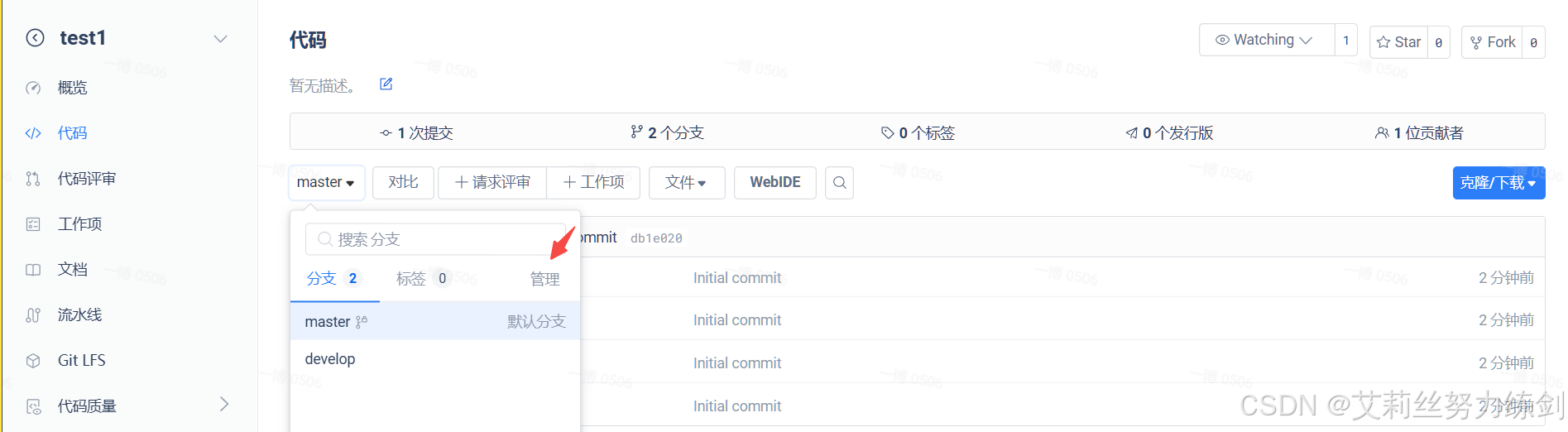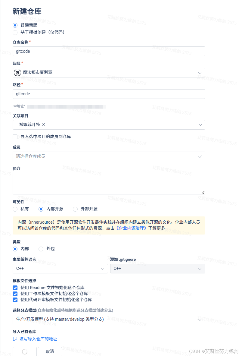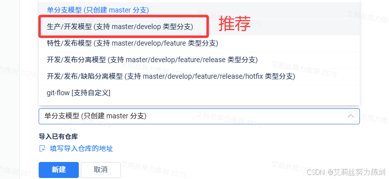 之所以推荐【生产/开发模型(支持master / develop 类型分支)】是因为master和develop这两个分支都是只读且唯一的,其它的分支可能有多个,我们将来需要手动创建,所以不要去选,选了会有什么问题?举个例子:比如你创建仓库时选了【开发/发布/缺陷分离模型(支持 master / develop / feature / release / hotfix 类型分支) 】,那么就相当于默认初始化了这几个分支,并且由于已经默认初始化了,会不允许创建同名分支------一旦创建就会告知创建失败!