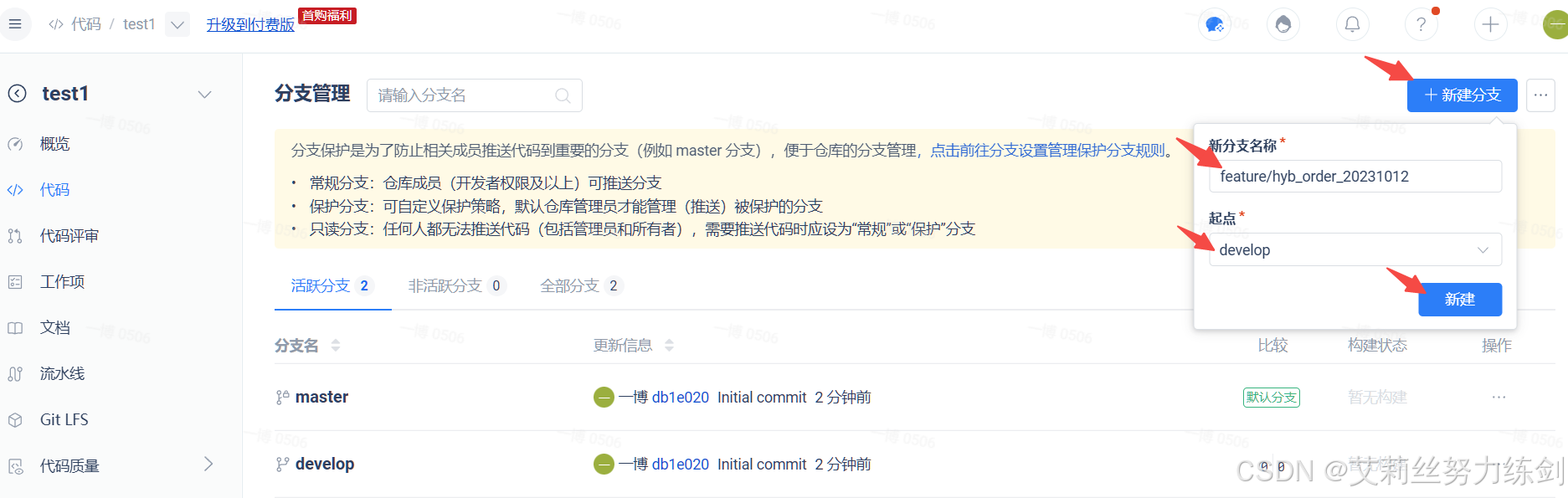 现在有一个订单管理的新需求需要开发,我们首先基于develop分支创建一个(命名规则前面介绍过了,这里不再赘述)feature/hyb_order_20231012分支。