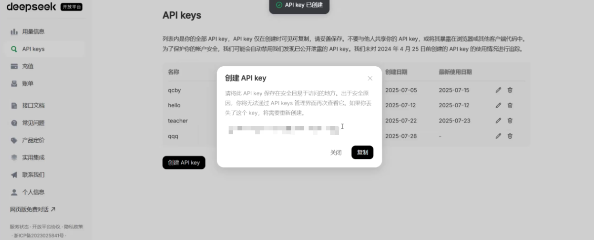创建成功后,要保存后弹框里的信息,因为关闭,就再也找不到了,除非删除,在重新创建 - 点击接口文档,找到对话,然后再最右边选择自己需要的语言。