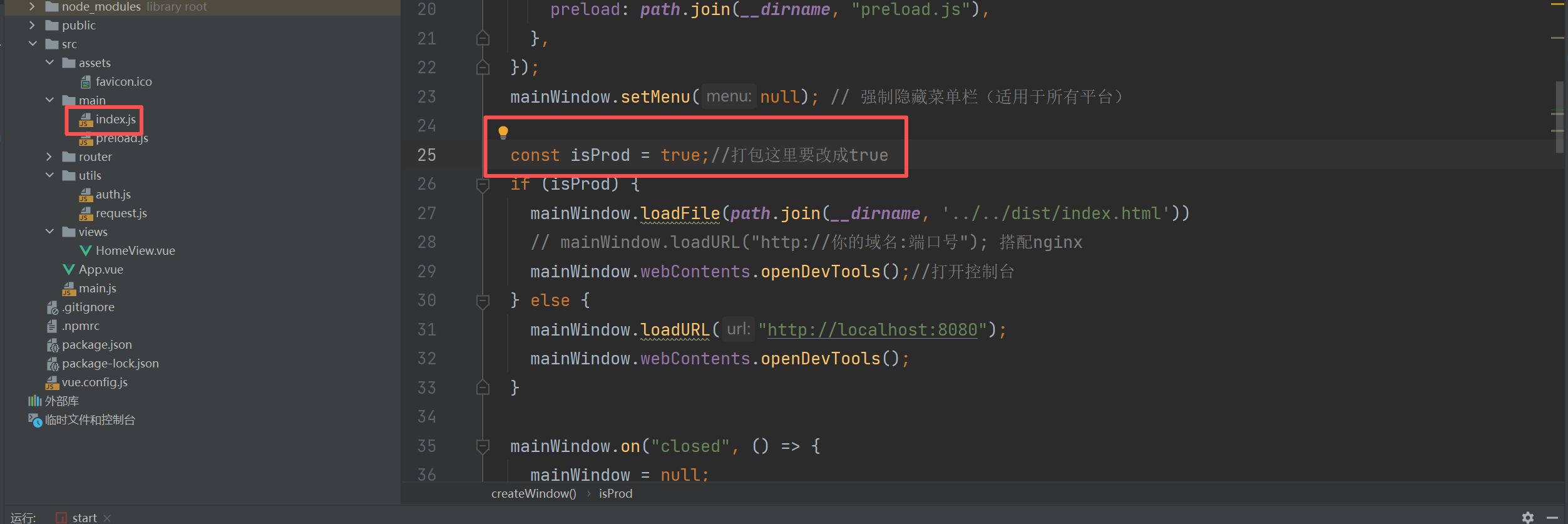 1、我们找到index.js文件,如果你要打包发布的话,需要把isProd这个参数设置为true,现在默认打包后应用运行方式是通过读取本地的dist文件进行运行的,并非运行在ip/域名上面,如果需要运行在ip/域名上面,请把dist文件交给nginx代理,然后把loadFile这行代码替换成loadURL即可。